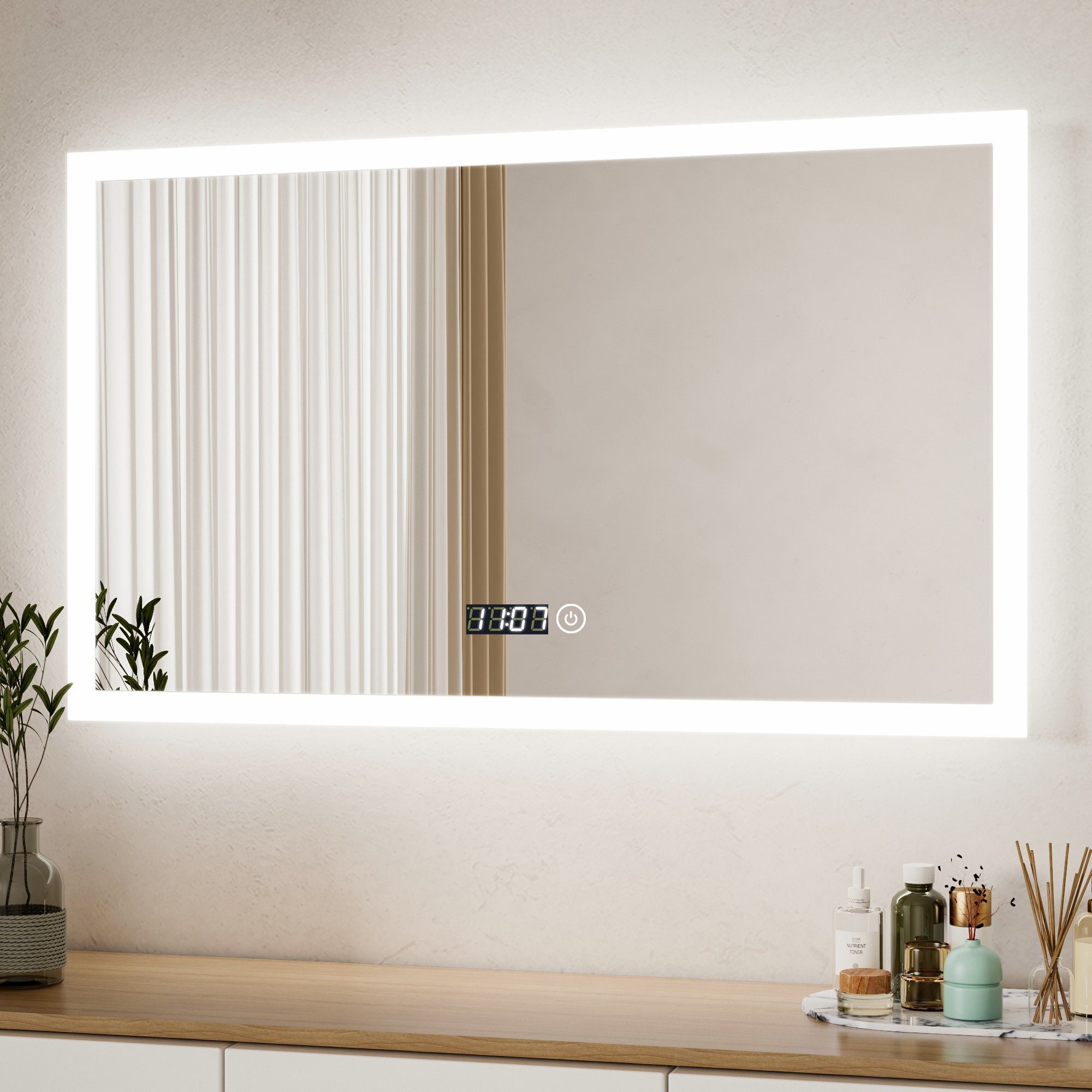WDWRITTI LED Badspiegel mit Uhr & Speicherfunktion 3Lichtfarben,Helligkeit einstellbar