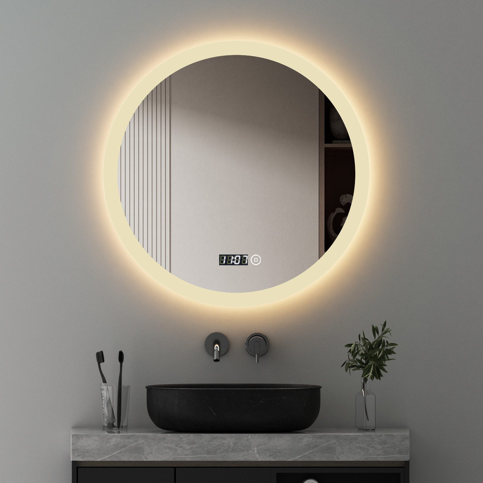 WDWRITTI LED Badspiegel mit Uhr & Speicherfunktion 3Lichtfarben+Helligkeit einstellbar IP44