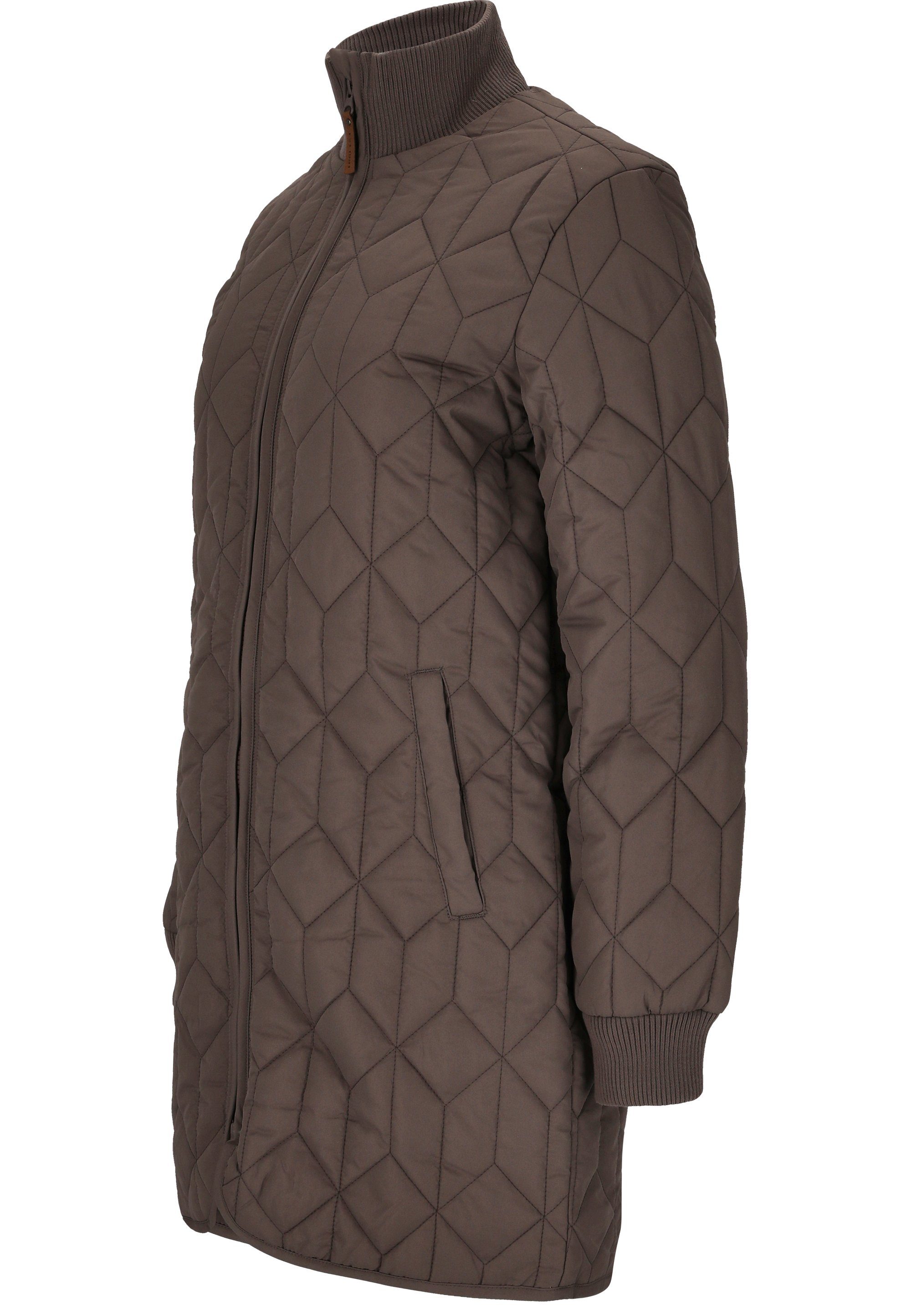 Auf der Suche nach einer braunen Steppjacke habe ich dieses Modell gefunden. Es handelt sich dabei für mich mit meinen 1,64 m um ein Mittelding aus Jacke und Mantel. Die Passform ist legere und kaschiert auch sehr gut die sogenannten Problemzonen. Diese Jacke fällt größengerecht aus und ist sehr gut verarbeitet. Das Material glänzt nicht, was für Mollige von Vorteil ist. Besonders gut gefallen mir der relativ eng anliegende hohe Stehkragen und der Verzicht auf eine Kapuze. Letztere ist fast immer unbrauchbar. Bei dieser Jacke stimmt fast alles. Die Wattierung hätte etwas wintertauglicher sein können, aber man kann nicht alles haben. Zusammen mit einer hellbraunen Outdoor-Weste ergibt sich ein tolles Outfit. Und für den Übergang ist diese Jacke sehr gut geeignet. Sie ist schlicht, sportlich und überhaupt nicht altbacken. Und der Reißverschluss ist leichtgängig und hakt absolut gar nicht. Ich bin jedenfalls sehr zufrieden, auch wenn ich eigentlich ne Winterjacke suchte