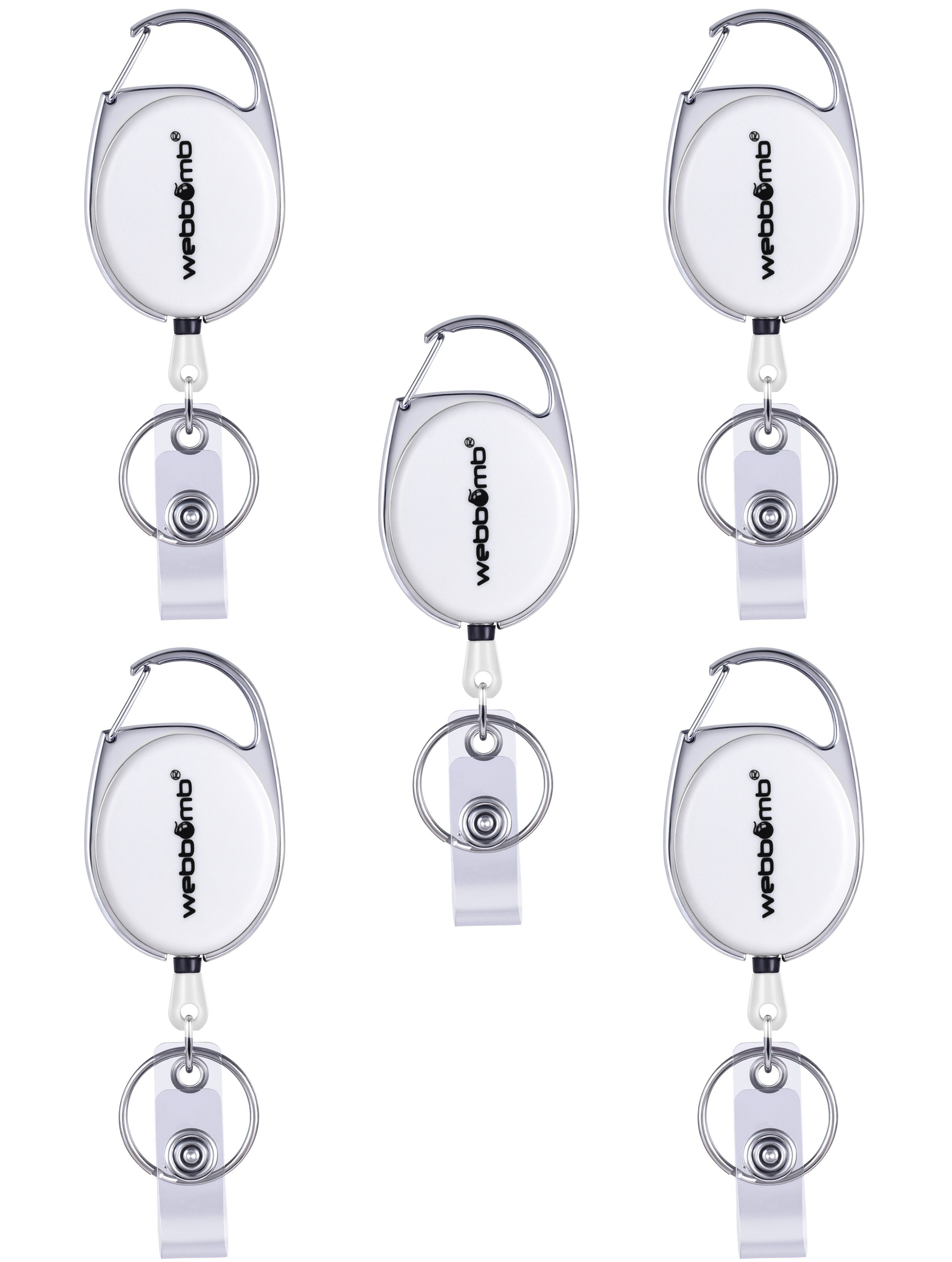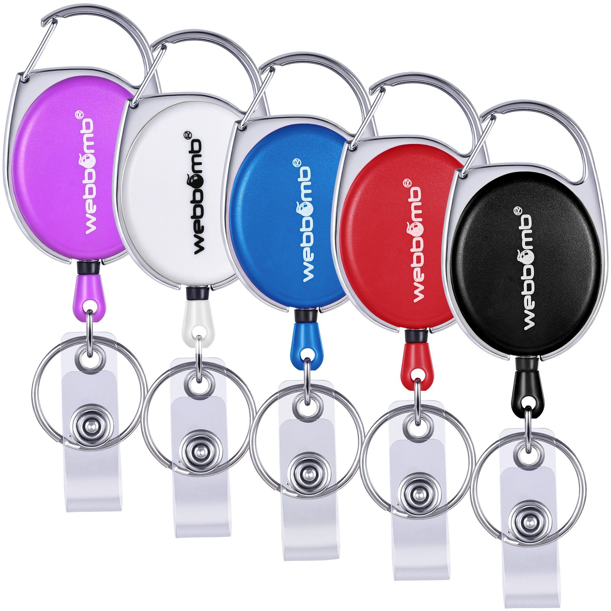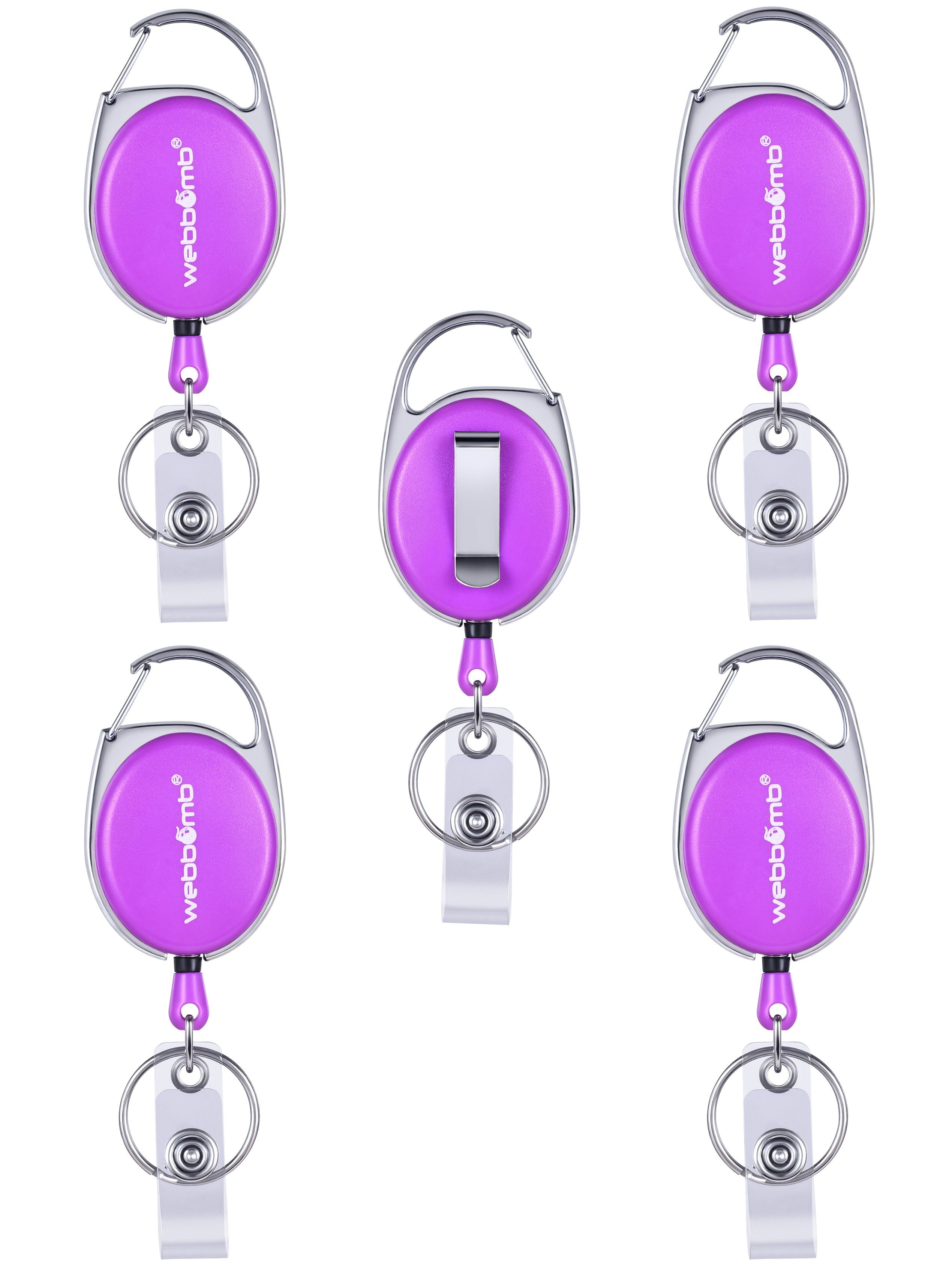 WEBBOMB 5 Stück bunte Ausweishalter mit JoJo bis ca. 65 cm ausziehbar 5 Farben ( lila, weiß, blau, rot und schwarz ) reißfeste Schnur und Gürtelclip + Schlüsselring + Vinylstrap