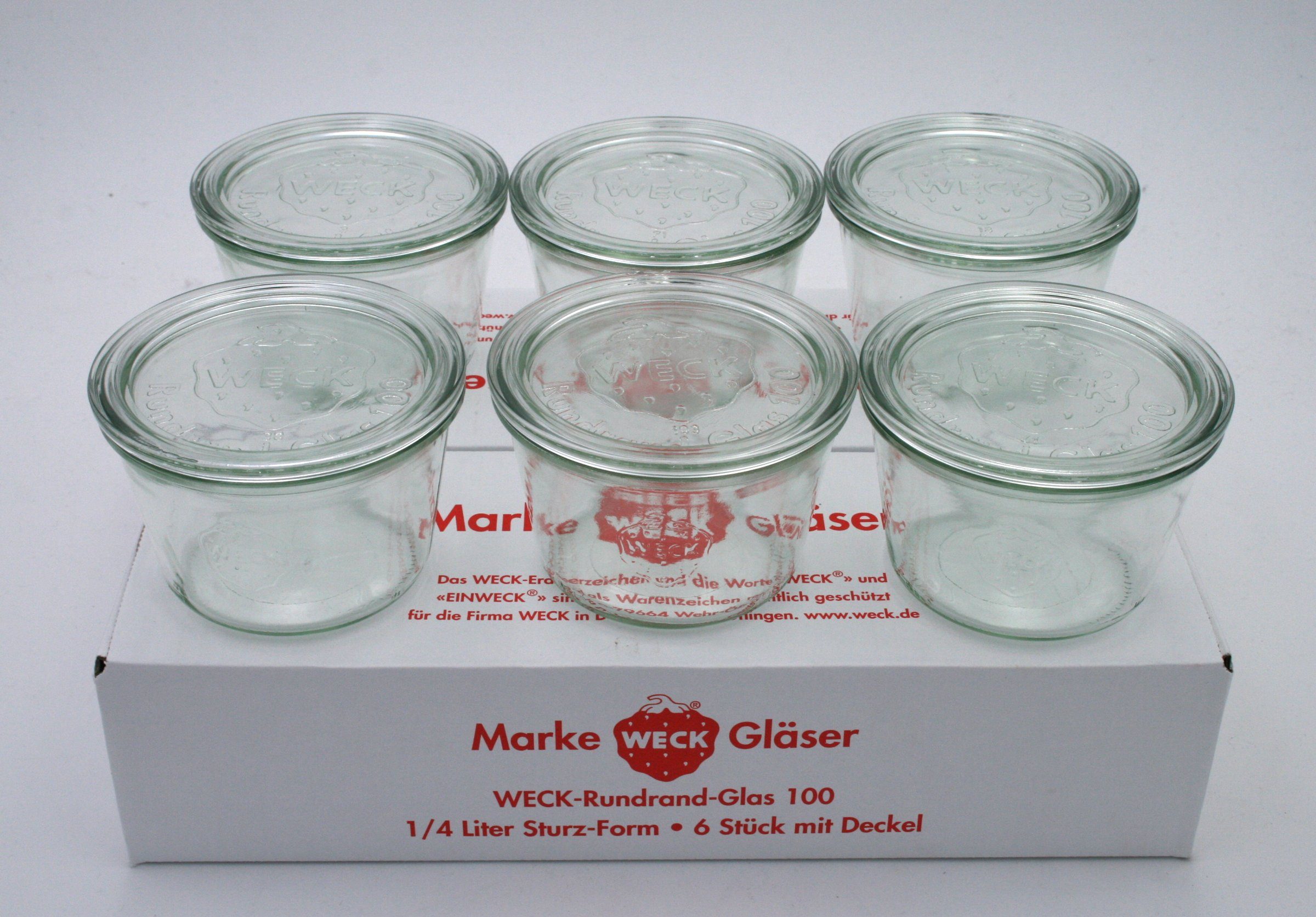 6 Weck Einkochgläser Sturzform 370 ml RR 100mm mit Glasdeckel Ideal geeignet zum Einmachen, Einkochen und Frischhalten! Maße: Höhe mit Deckel 73 mm Durchmesser 110 mm Volumen (komplett gefüllt) 370 ml Lieferumfang: 6 Gläser mit Deckeln