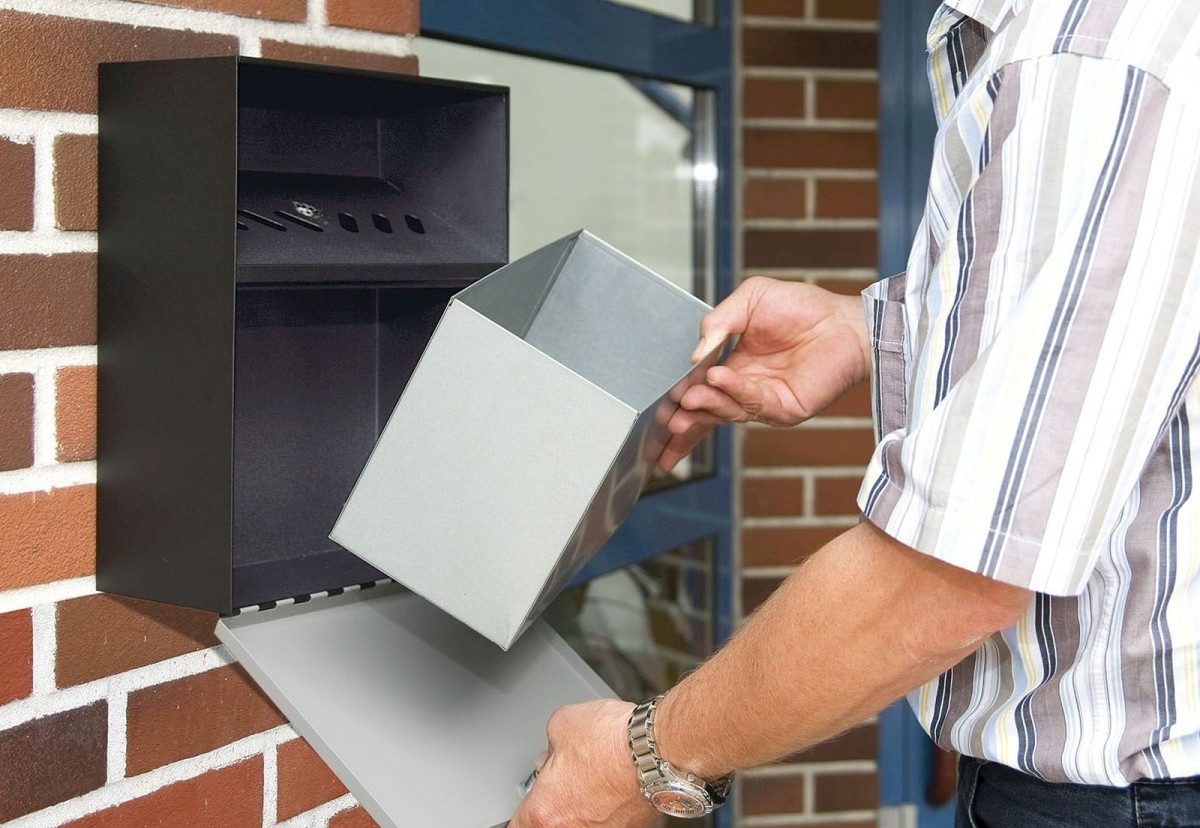 • WEDO Wandascher mit Wetterschutzdach aus pulverbeschichtetem Stahlblech mit schwarzem Korpus und grauer Tür.