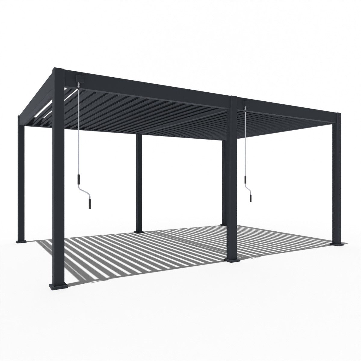 Die hochwertigen Aluminiumlamellen lassen sich bequem und stufenlos einstellen. Im Handumdrehen verändern Sie synchron den Neigungswinkel aller Lamellen und bestimmen hierdurch den passenden Lichteinfall. Somit lassen sich herrliche Lichtstimmungen erzeugen. Natürlich schützt Sie der Pavillon auch optimal gegen UV-Strahlung. Bei vollständig geschlossenen Lamellen bietet die Pergola Schutz vor Sonne und leichtem Regen. Die integrierte Regenrinne sorgt dabei dafür, dass Regenwasser kontrolliert über das Innere der Aluminium-Pfosten abgeleitet wird.