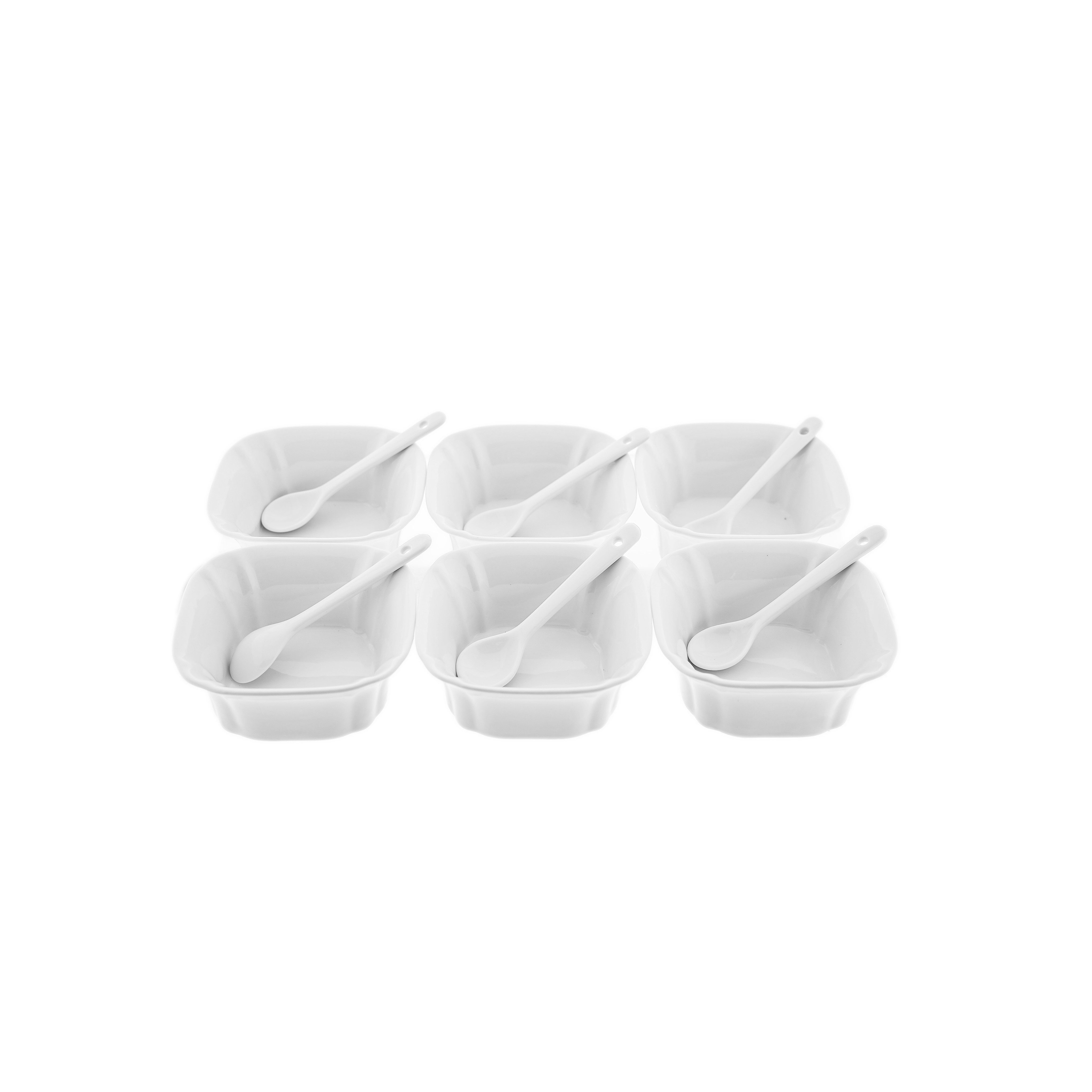 Verleihe deinen Snacks, Desserts oder Vorspeisen eine stilvolle Präsentation mit diesem eleganten Schalen-Set aus hochwertigem Porzellan. Das Set besteht aus 6 weißen Schalen und 6 passenden Löffeln – perfekt für Eis, Pudding, Saucen, Tapas oder kleine Beilagen.