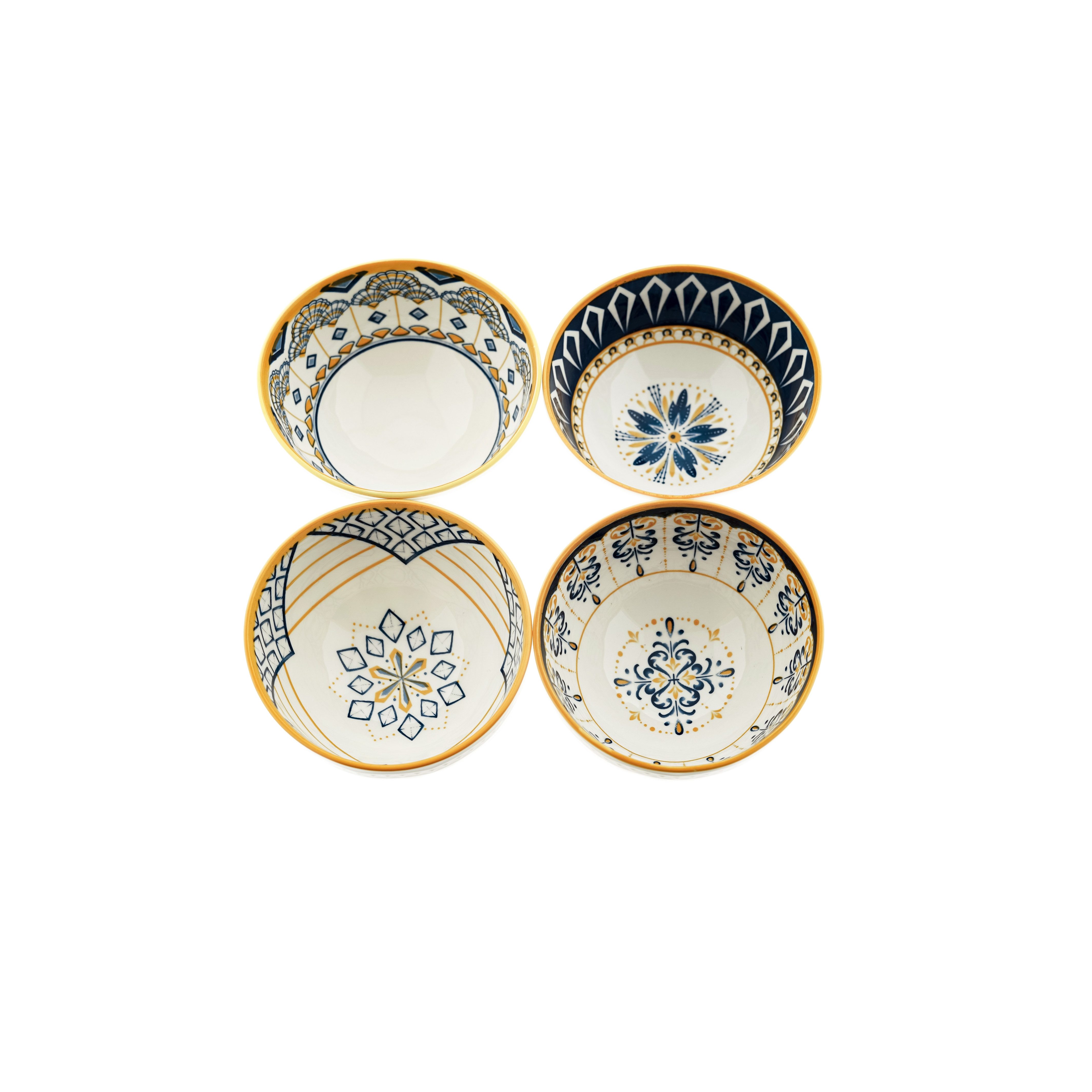 Verleihen Sie Snacks, Vorspeisen oder Desserts eine besondere Note – mit dem dekorativen 4er Set Snackschalen aus hochwertigem Porzellan. Die Schalen bestechen durch ihre charmanten Muster in dezenten blau und gelb Tönen auf weißem Grund und bringen Abwechslung auf jeden Tisch. Mit einem Durchmesser von 11 cm und einer Höhe von 6 cm eignen sie sich perfekt für Nüsse, Dips, Obst oder kleine Beilagen.