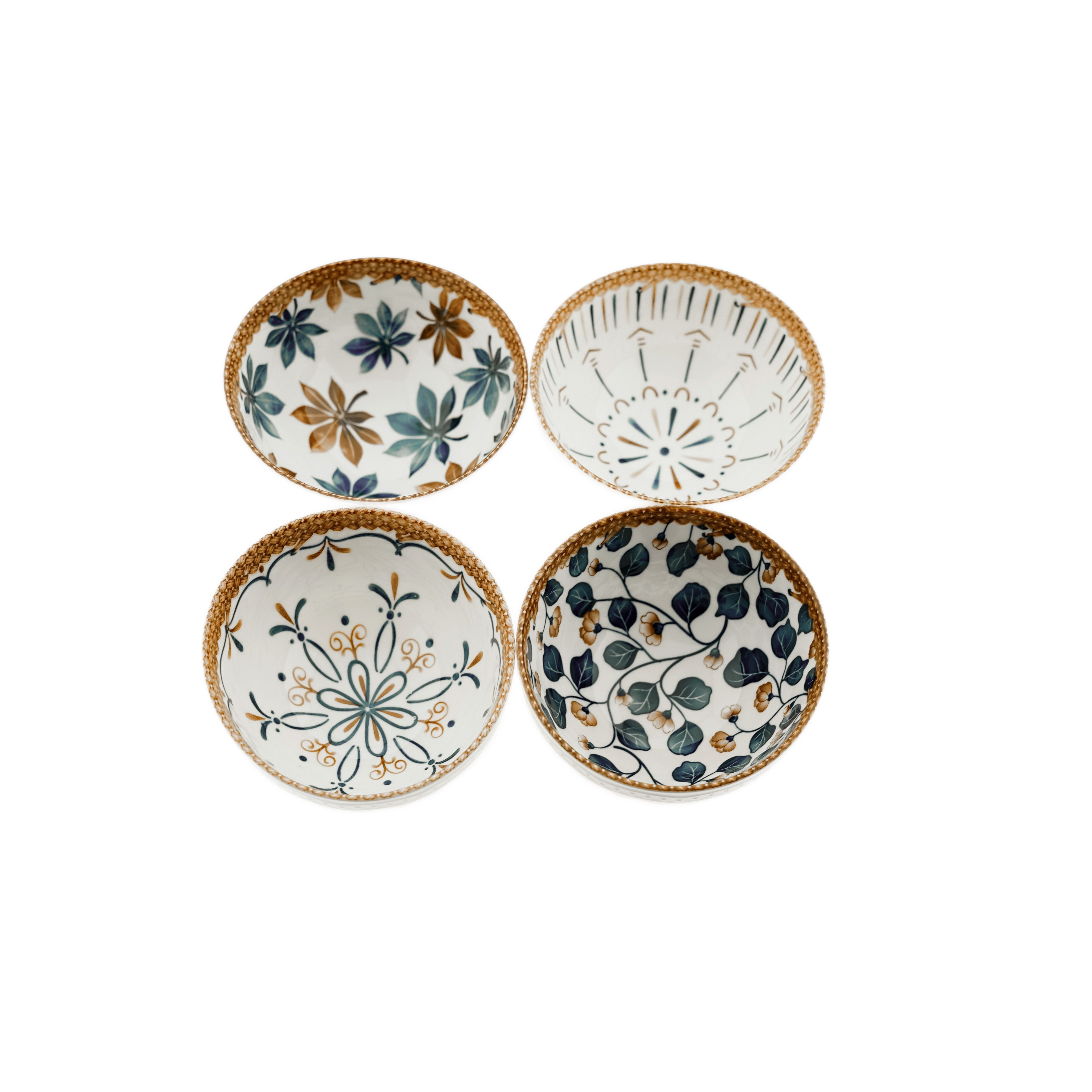 Verleihen Sie Snacks, Vorspeisen oder Desserts eine besondere Note – mit dem dekorativen 4er Set Snackschalen aus hochwertigem Porzellan. Die Schalen bestechen durch ihre charmanten Muster in dezenten blau und braun Tönen auf weißem Grund und bringen Abwechslung auf jeden Tisch. Mit einem Durchmesser von 11 cm und einer Höhe von 6 cm eignen sie sich perfekt für Nüsse, Dips, Obst oder kleine Beilagen.