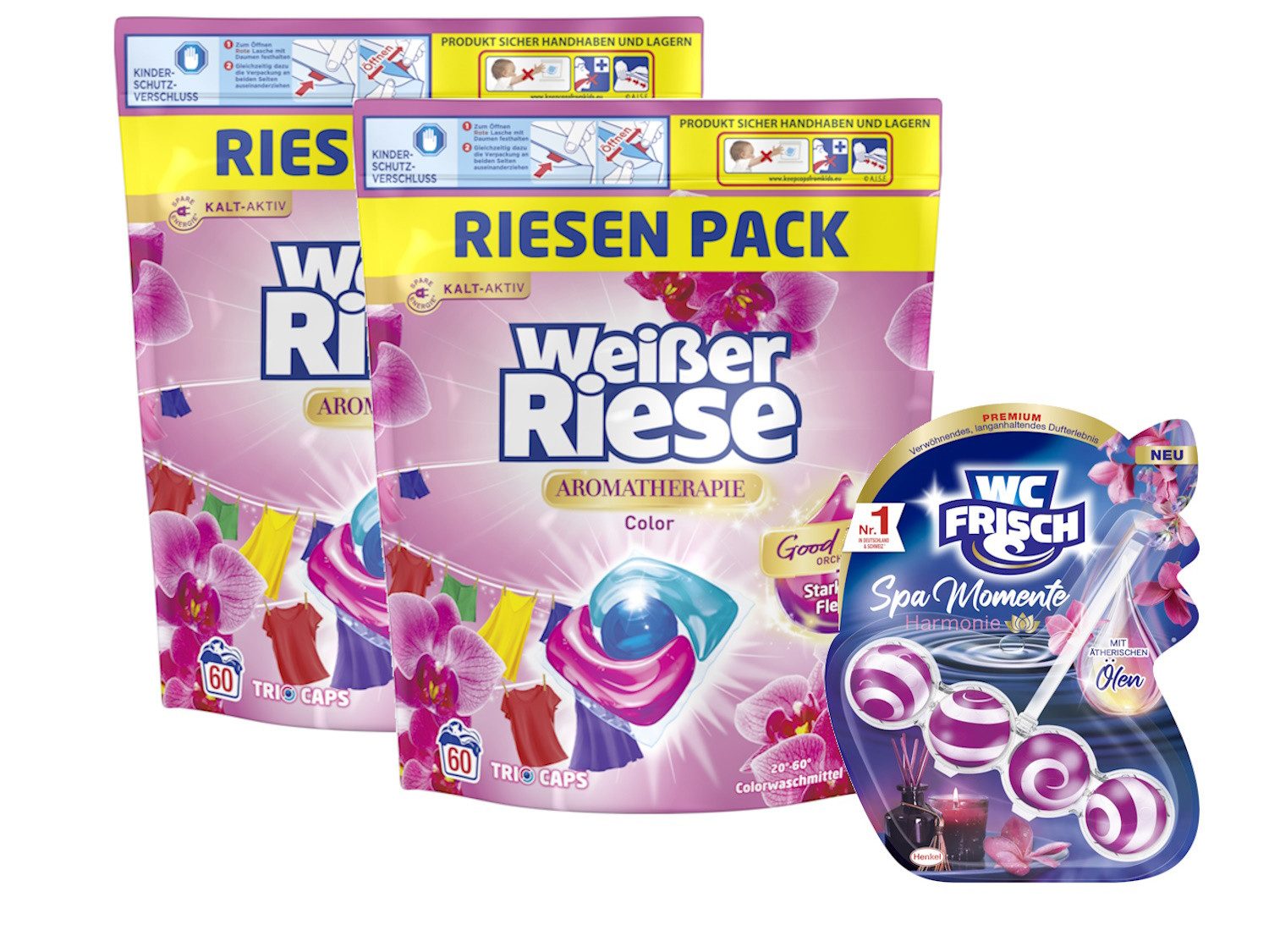 Weißer Riese Color Trio-Caps Aromatherapie Floral Sensation – Ein pflegendes Dufterlebnis, das anhält Die Weißer Riese Aromatherapie Floral Sensation Color Trio Caps bieten ein einzigartiges und langanhaltendes Dufterlebnis. So waschen sie die Kleidung nicht nur strahlend sauber, sondern hüllen sie dank der natürlichen Blütenessenzen in einen blumig-aromatischen Duft und verwöhnen zusätzlich, dank verbesserter Formel, mit einer intensiven Frische. Das Waschmittel verwandelt jede Ladung frischer Wäsche in ein luxuriöses Dufterlebnis aus Orchidee. Produktvorteile im Detail: Mit natürlichen Blütenessenzen Luxuriöses Dufterlebnis Langanhaltende Frische Riesig stark gegen Flecken Einfache Anwendung