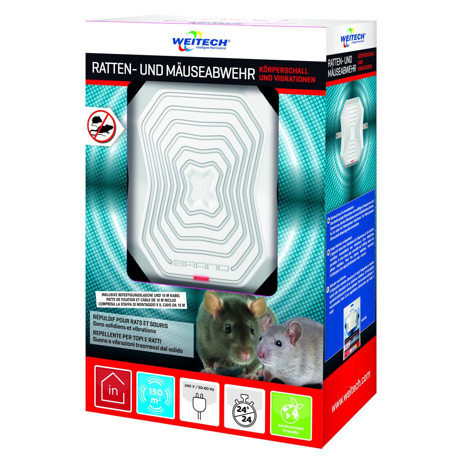 Weitech Indoor Ratten- und Mäuseabwehr vertreibt und wehrt Schädlinge mit der Abgabe von Körperschall und Vibration ab. Ratten, Mäuse, Siebenschläfer, Gartenschläfer, Eidechsen werden aus dem Haus, vom Dachboden, aus der Trennwand, Dämmung etc. vertrieben.
