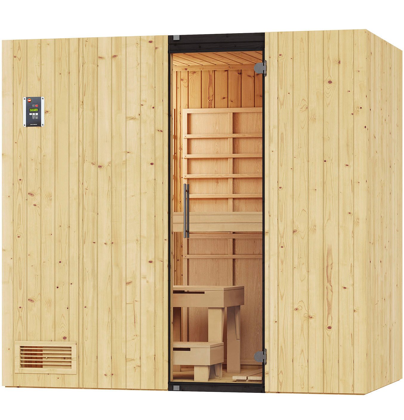 Installationshinweis | Bei Saunen mit Ofen ist der E-Anschluss nur durch eine Elektrofachkraft vorzunehmen. |