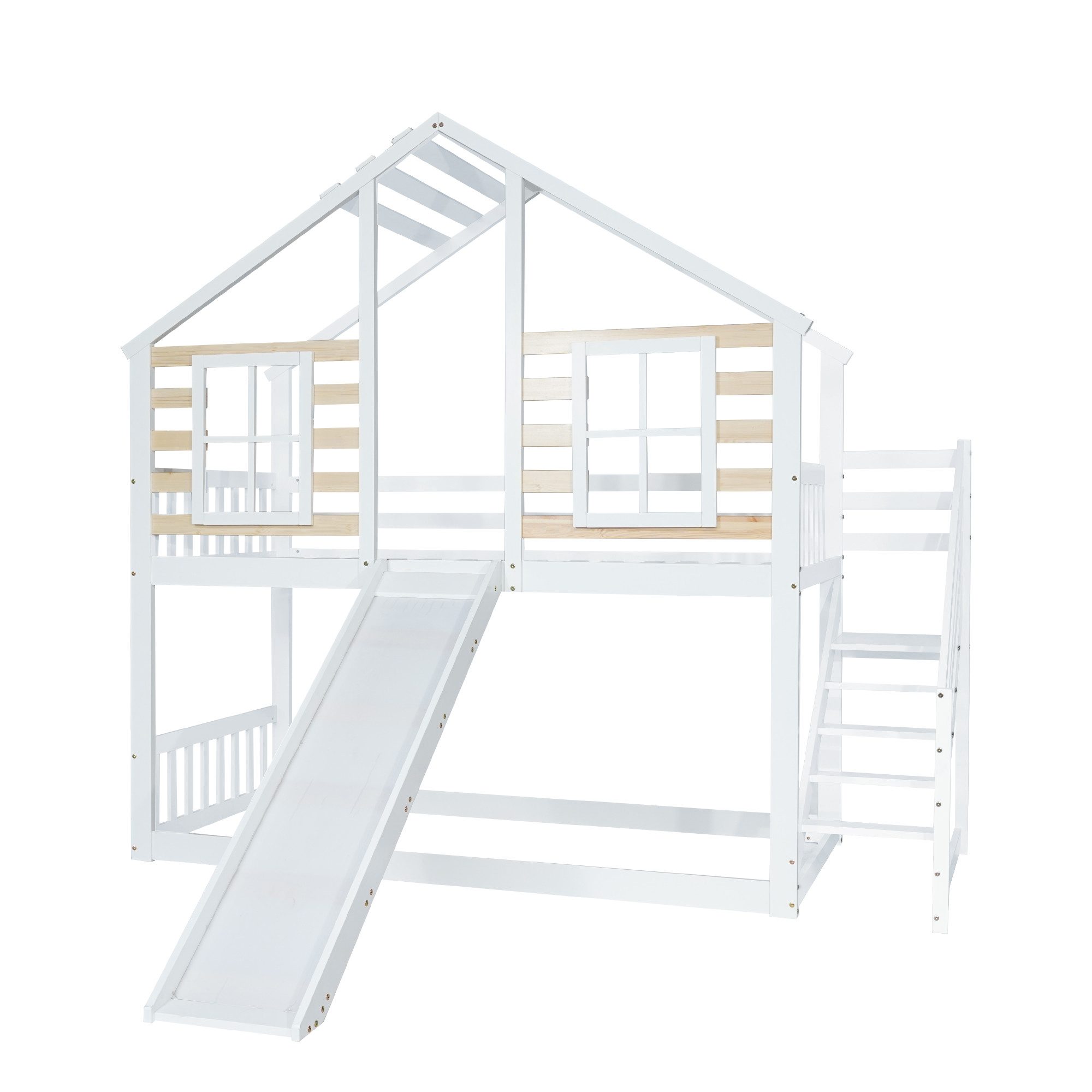 "Spezifikationen Produkttyp: Kombiartikel Produktname:Etagenbett, Holzbett mit Treppe und Gitter, mit Rutsche und Fenster, Blockhaus Kinderbett mit Absturzsicherung, Bettrahmen aus Massivholz, Weiß(90x200 cm) Hauptfarbe: Weiß Hauptmaterial: Massivholz + MDF Produktname: Etagenbett Farbe: Weiß Stellmaterial: Holz+MDF Lattenmaterial: Holz Montageverfahren: selbst installieren Paketnummer: 2 Gesamtgröße: 242*232*222cm Gesamtgewicht: 58 kg Passende Matratzen (Matratze nicht enthalten): 90x200cm Tragfähigkeit: 100 kg