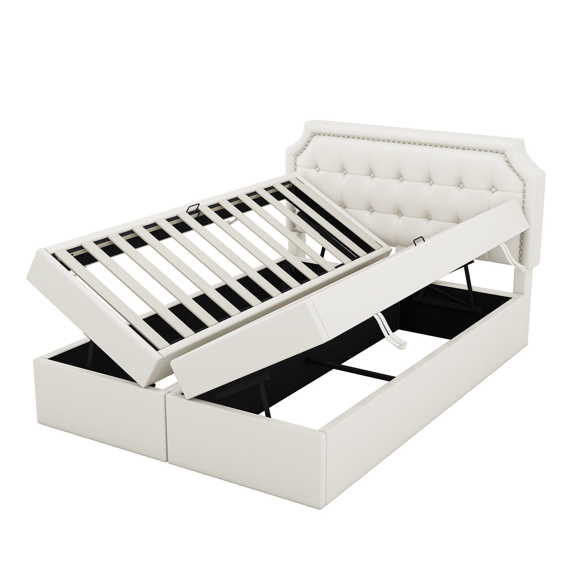 Stauraum-Merkmale: Das Queensize-Bett bietet viel Stauraum für Decken, Kissen oder Bettwäsche unter dem klappbaren Lattenrost, der mit Hilfe von Hebezylindern einfach hochgeklappt werden kann.