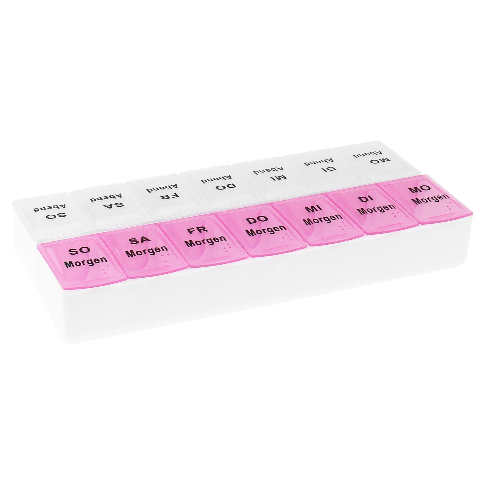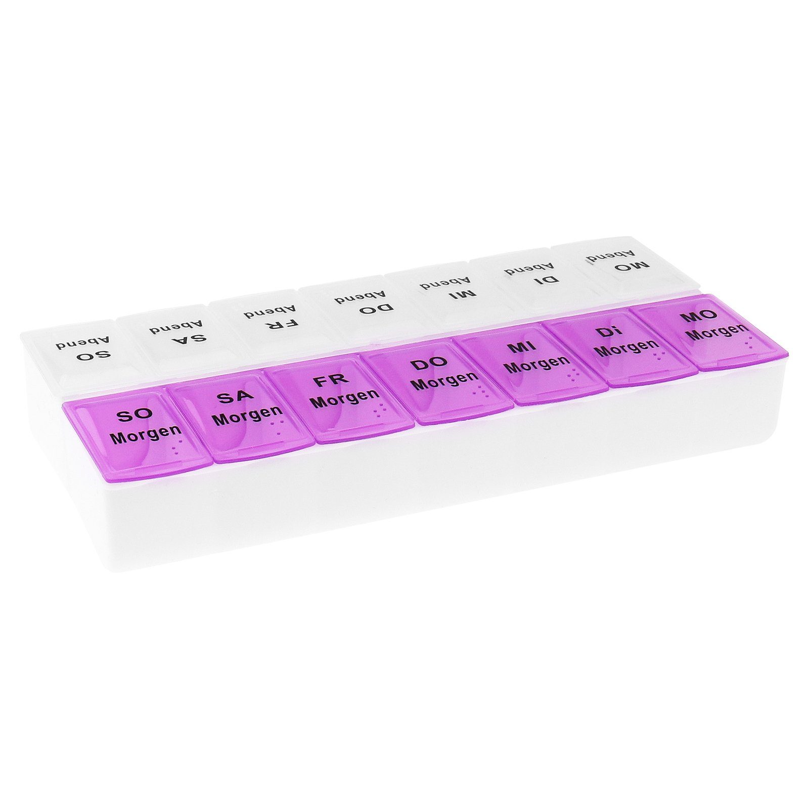 Die mit Wochentagen beschrifteten Tagesfächer verfügen über einen leichtgängigen Klappdeckel.