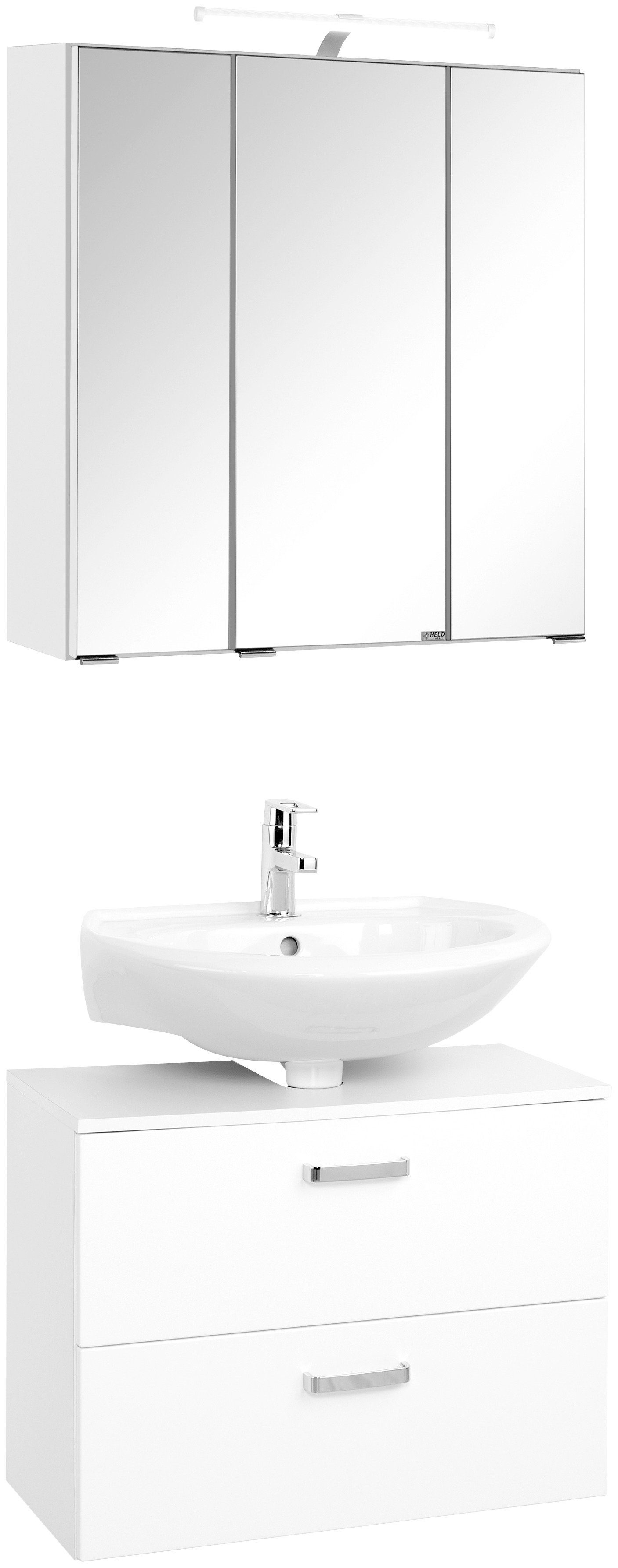 Wissenswertes | Produktdetails Gesamtbreite: 70 cm Frontmaterial: MDF Softclose: Ja Lieferhinweis: Lieferung ohne Dekoration und Armatur. Все Maße sind ca. Angaben Set bestehend aus: 1 x Waschbeckenunterschrank, 1 x Spiegelschrank Setdetails Spiegelschrank Maße (B/T/H): 70/20/64 cm Art: 3D-Spiegelschrank Anzahl Türen: 3 Stk. Anzahl Einlegeböden: 6 Stk. inkl. Leuchtmittel: Ja Anzahl Leuchtmittel: 1 Stk. Verbrauch: 4,5 W Leuchtmitteltyp: LED Schalter: Ja Steckdose: Ja Zusatzinformationen: Inkl. Konverter Waschbeckenunterschrank Maße (B/T/H): 70/35/54 cm Siphonausschnitt: Ja Anzahl Türen: 1 Stk. Anzahl Schubladen: 1 Stk. Hinweise Montage: Selbstmontage inkl. Aufbauanleitung Herstellergarantie: 5 Jahre auf Konstruktions- und Verarbeitungsqualität Dekor: graphitfarben, weiss glanz Modellbezeichnung: Dorina Dekor: weiss glanz Modellbezeichnung: Dorina |
