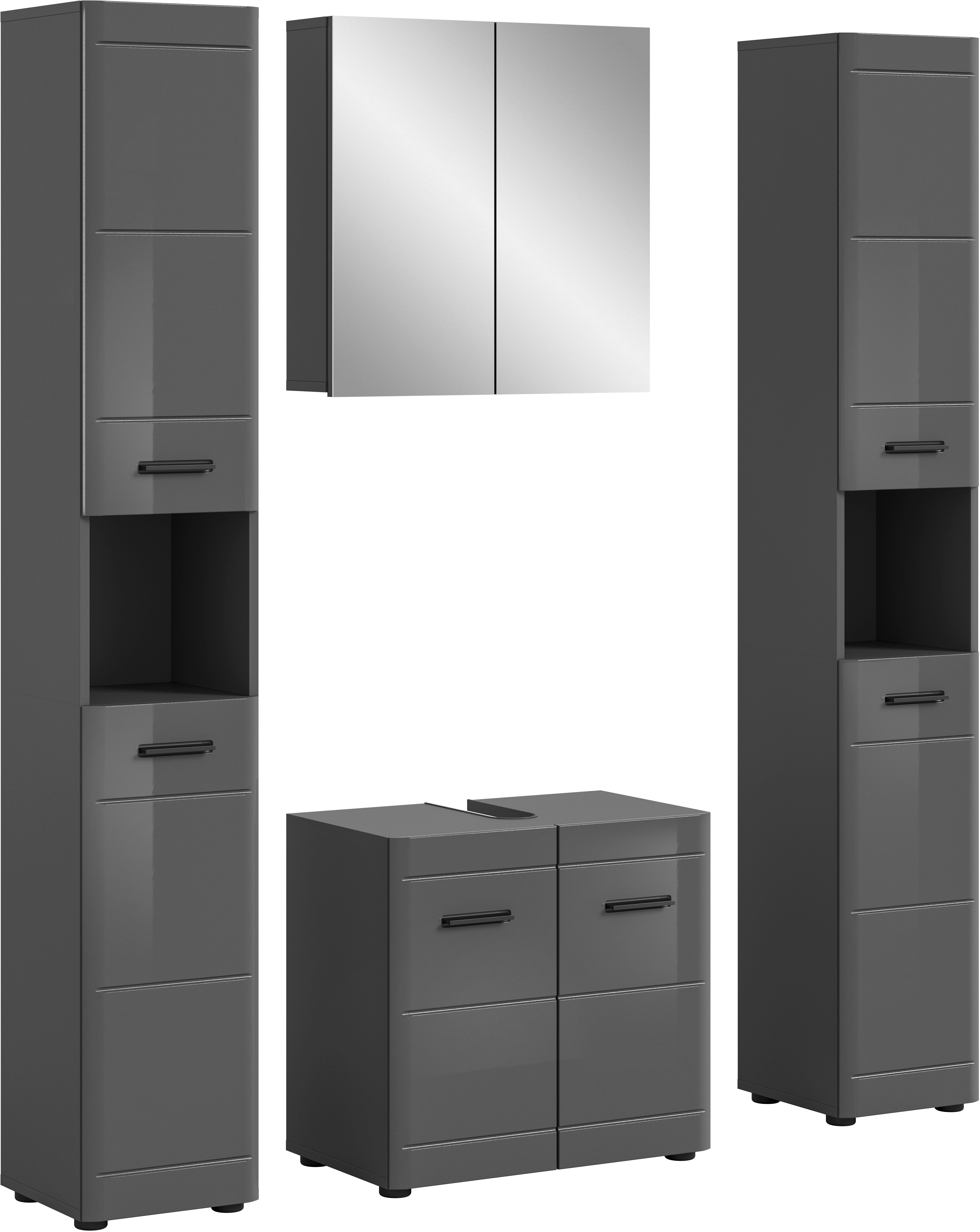 Set beinhaltet | 2x Hochschrank, 1x Waschbeckenunterschrank, 1x Spiegelschrank |