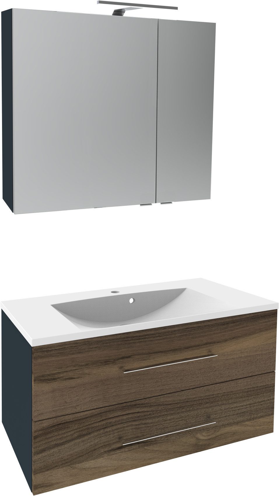 Set beinhaltet | Spiegelschrank, Gussmarmorbecken, Waschtischunterbau |