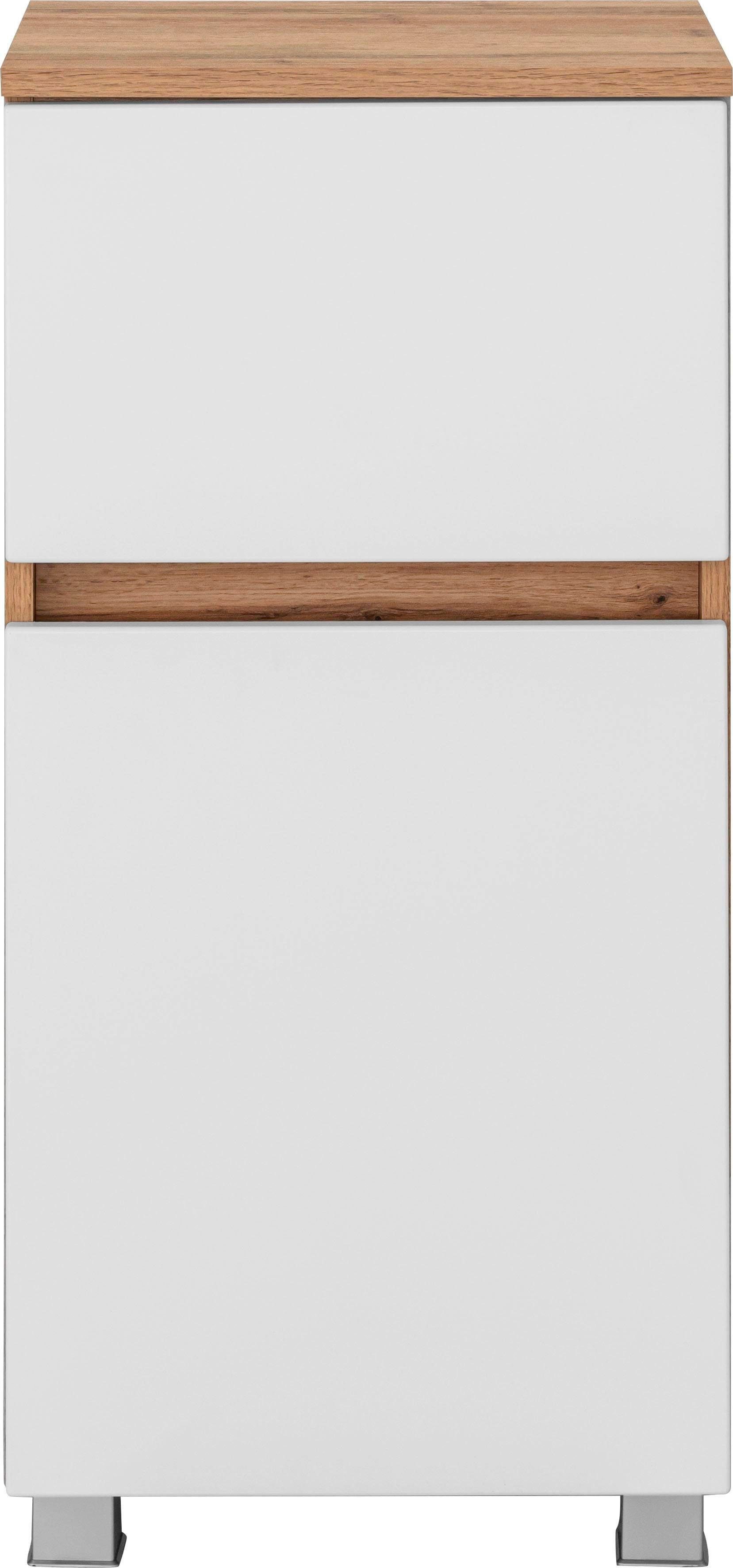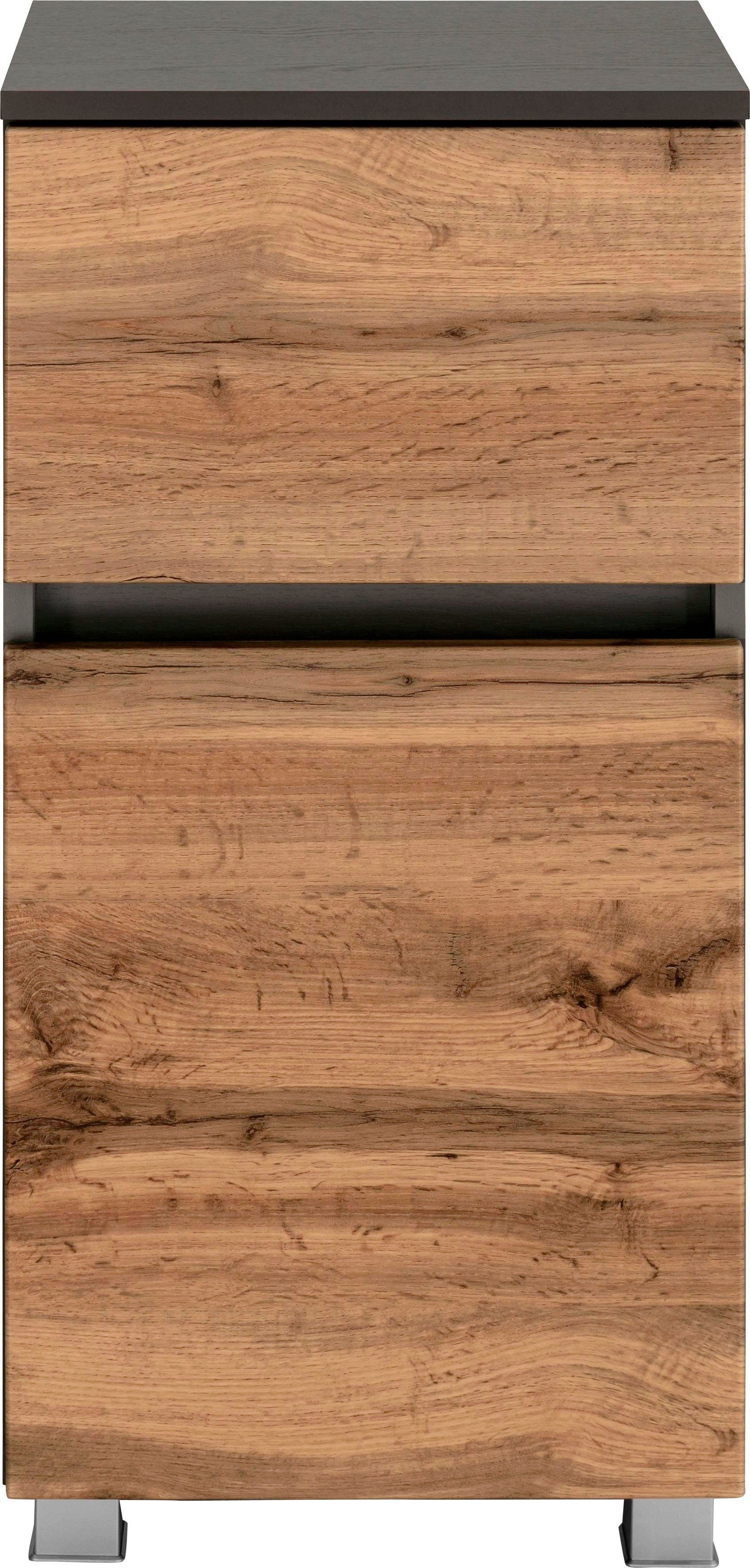 Wissenswertes | Edel kommt das Badprogramm Lucca daher! Die urige Optik der Eiche trifft hier auf mattweiße und mattgraue Oberflächen? dies ergibt einen harmonischen Mix, der eine außergewöhnliche Wohlfühlatmosphäre in Ihrem Bad entstehen lässt. Eine ganz besondere Optik wird durch die im Korpusdekor abgesetzten Griffnischen zwischen den MDF-Fronten erzielt, durch die gänzlich auf hervorstehende Griffe verzichtet werden kann. Nicht nur in der Optik, auch in der Bedienbarkeit spüren Sie den Luxus, denn alle Türen und Auszüge sind mit hochwertigen Softclose-Auszügen bzw. Scharnieren ausgestattet. Aus einem großen Typenplan mit verschiedenen Waschtischbreiten und zusätzlichen Ergänzungsmöbeln können Sie sich die Kombinationen auszusuchen, die zu Ihnen und Ihren Möglichkeiten passen. Schöne Stunden in Ihrem neuen Wellnesstempel stehen Ihnen bevor! In folgenden Farben erhältlich: