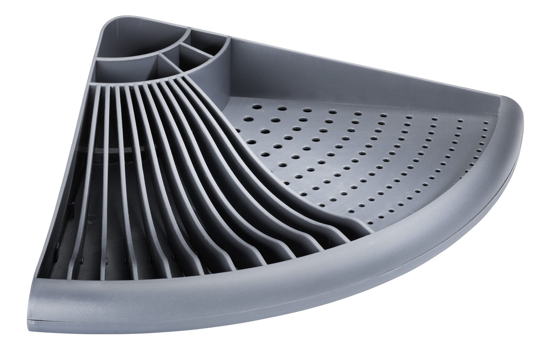 Durch die dreieckige Form eignet sich dieser praktische Helfer speziell für alle Küchenecken. Die abnehmbare Abtropfschale vereinfacht das Abgießen von Wasser und erleichtert die Reinigung. Dabei bleibt die Arbeitsplatte stets trocken.