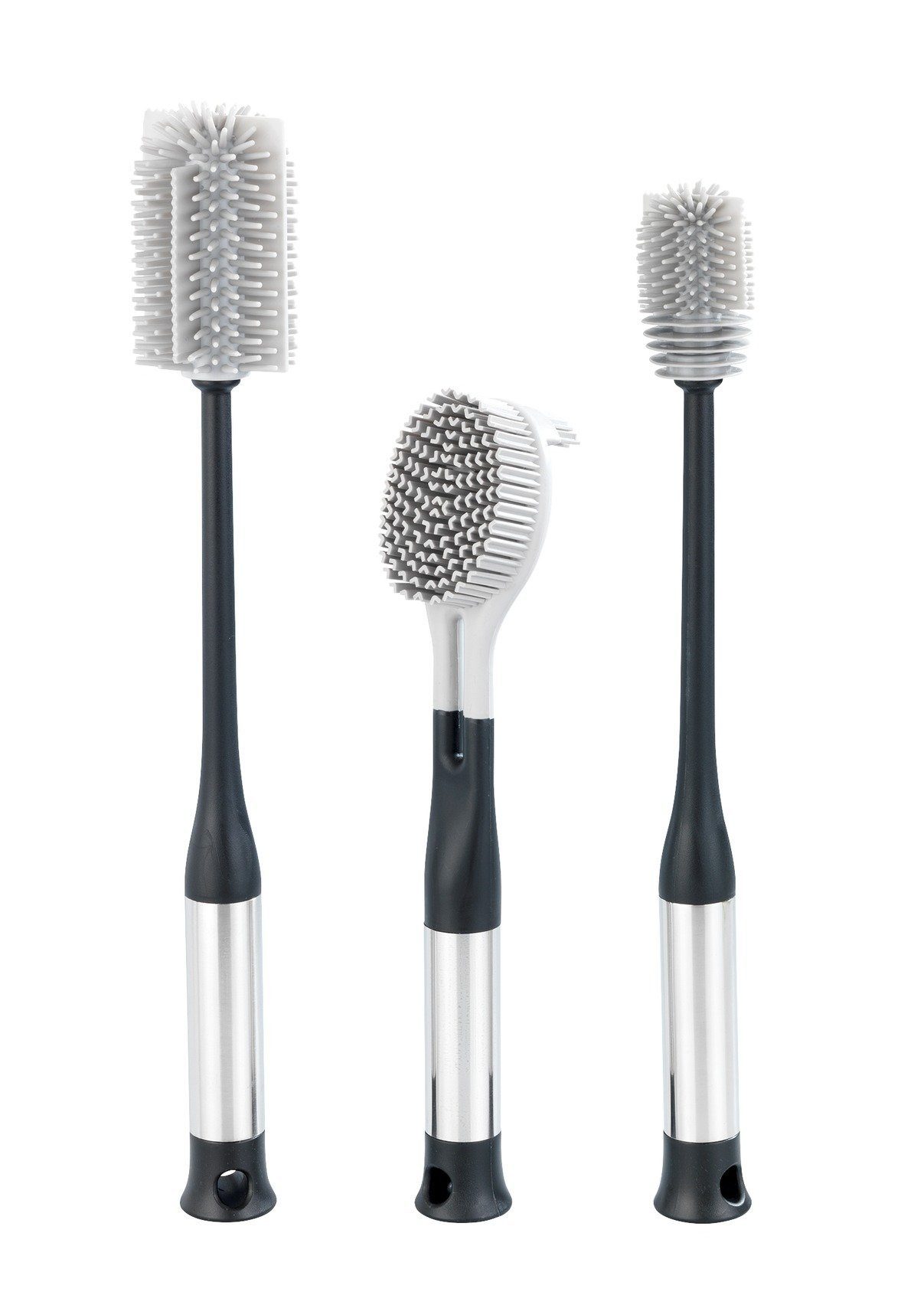 Eine Reihe von Reinigungsbürsten besteht aus 3 Komponenten. Jede Bürste hat eine andere Spitze, die mit zahlreichen Vorsprüngen ausgestattet ist, die Bürsten entfernen effektiv Schmutz und hartnäckige Verunreinigungen von verschiedenen Oberflächen. Bürsten erleichtern das Reinigen schwer zugänglicher Stellen und jeder hat einen praktischen Griff für eine einfache Handhabung. Sie werden ihre Aufgabe sowohl beim Waschen von Flaschen, Gläsern als auch von anderen Gerichten,die mit einem herkömmlichen Schwamm schwer zu reinigen sind, perfekt erfüllen.