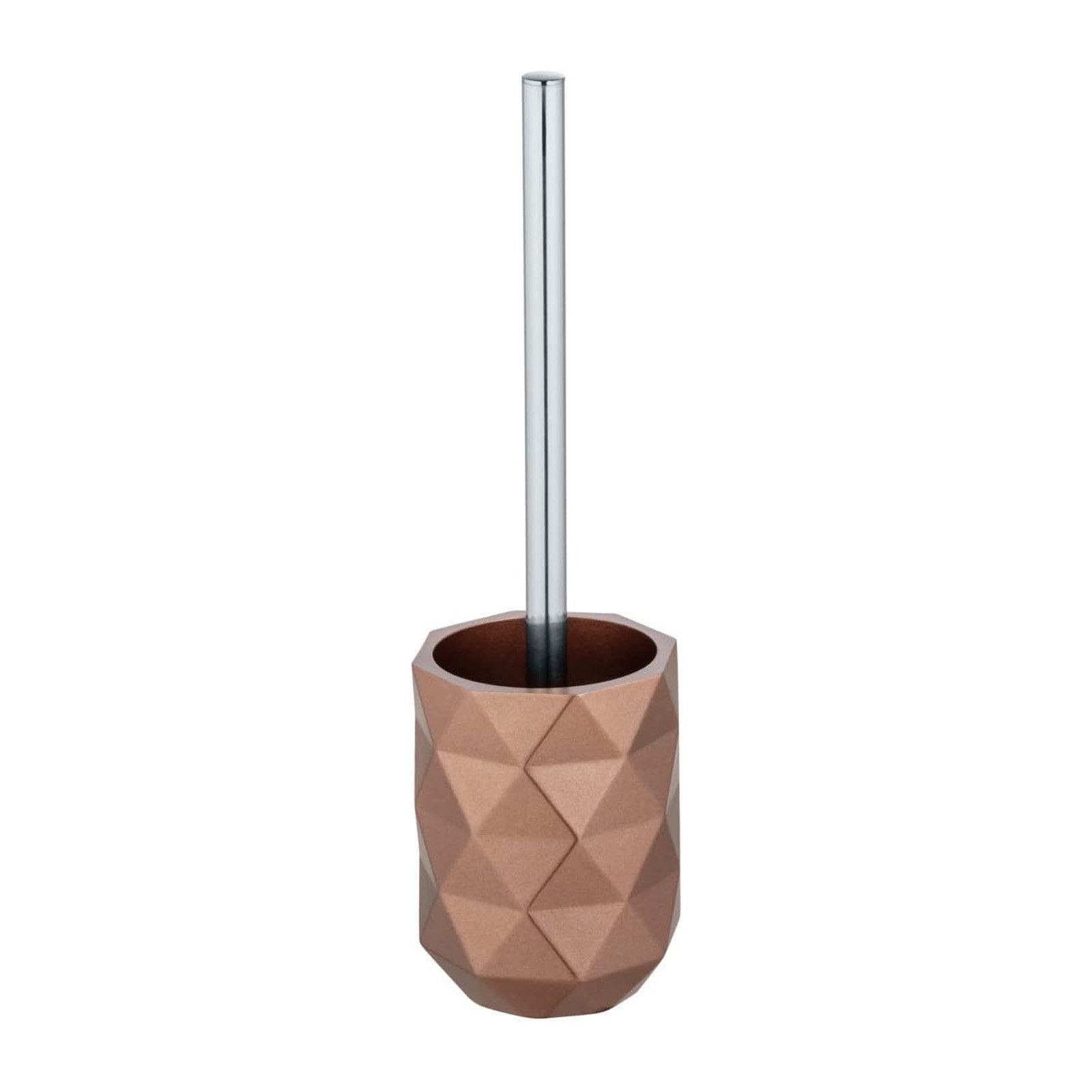 Die WC-Garnitur Lanciano beeindruckt durch ihr auffälliges Design. Der Behälter aus dem hochwertigen Kunststoff Polyresin hat eine strukturierte Oberfläche mit geometrischem Rautenmuster, das bei Lichteinfall glänzend erscheint. Die Farbe Bronze macht den unverzichtbaren Alltagsgegenstand zu einem eleganten Bad-Accessoire, das sofort ins Auge fällt. Die WC-Bürste mit schwarzem, auswechselbaren Bürstenkopf (Ø 8 cm) aus Kunststoff rundet das Design mit dem eleganten silberfarbenen Stiel aus Edelstahl ab. Der nützliche WC-Bürstenhalter findet mit seinen Maßen von Ø 11 x 37 cm auch in kleineren Badezimmern neben der Toilette Platz und wird dort zum echten Blickfang. Die moderne Farbgebung in Bronze wertet sowohl hell als auch dunkel eingerichtete Bäder auf. Kombiniert mit hellen Fliesen ergibt sich ein glanzvolles Bild. Mit dunklen Farben gerät das Bad zum eleganten Wohlfühlort. Passend zum Bronze-Ton können Grünpflanzen zu einem trendigen Raumkonzept beitragen. Stilvoller Toilettenbürsten-Halter in Bronzefarbe