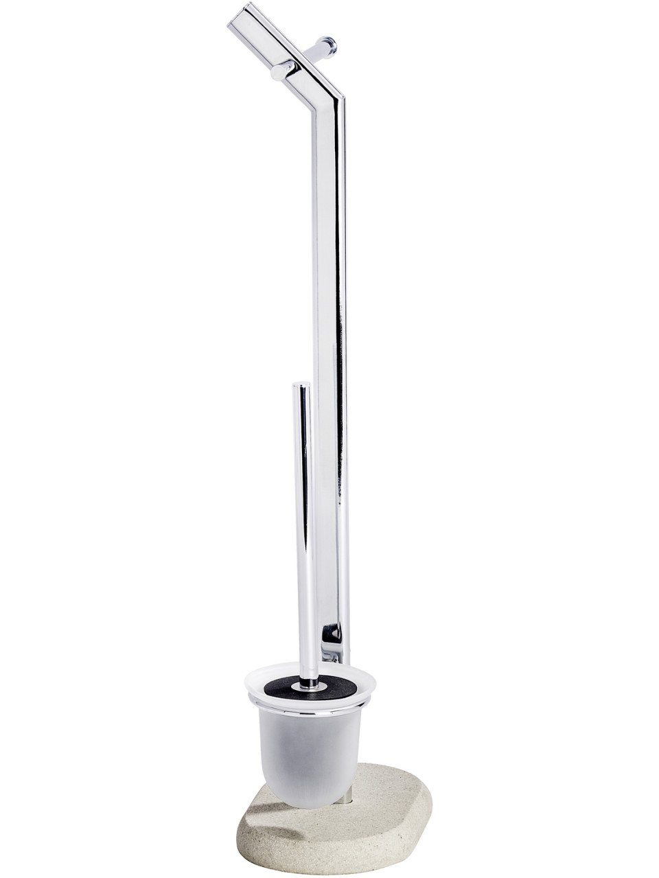 Kombination aus offenem Toilettenbürstenhalter und Toilettenpapier-Rollenhalter. Elegantes Chrom-Gestell und hochwertiger Glaseinsatz ideal für Bad und Gäste-WC. Mit diesem praktischen Helfer werden Papier und Bürste stets griffbereit und dekorativ aufbewahrt. Die schöne Bodenplatte in Sandoptik sorgt für stabilen Halt. Inklusive WC-Bürste mit auswechselbarem, schwarzem Bürstenkopf von Ø 7,5 cm.