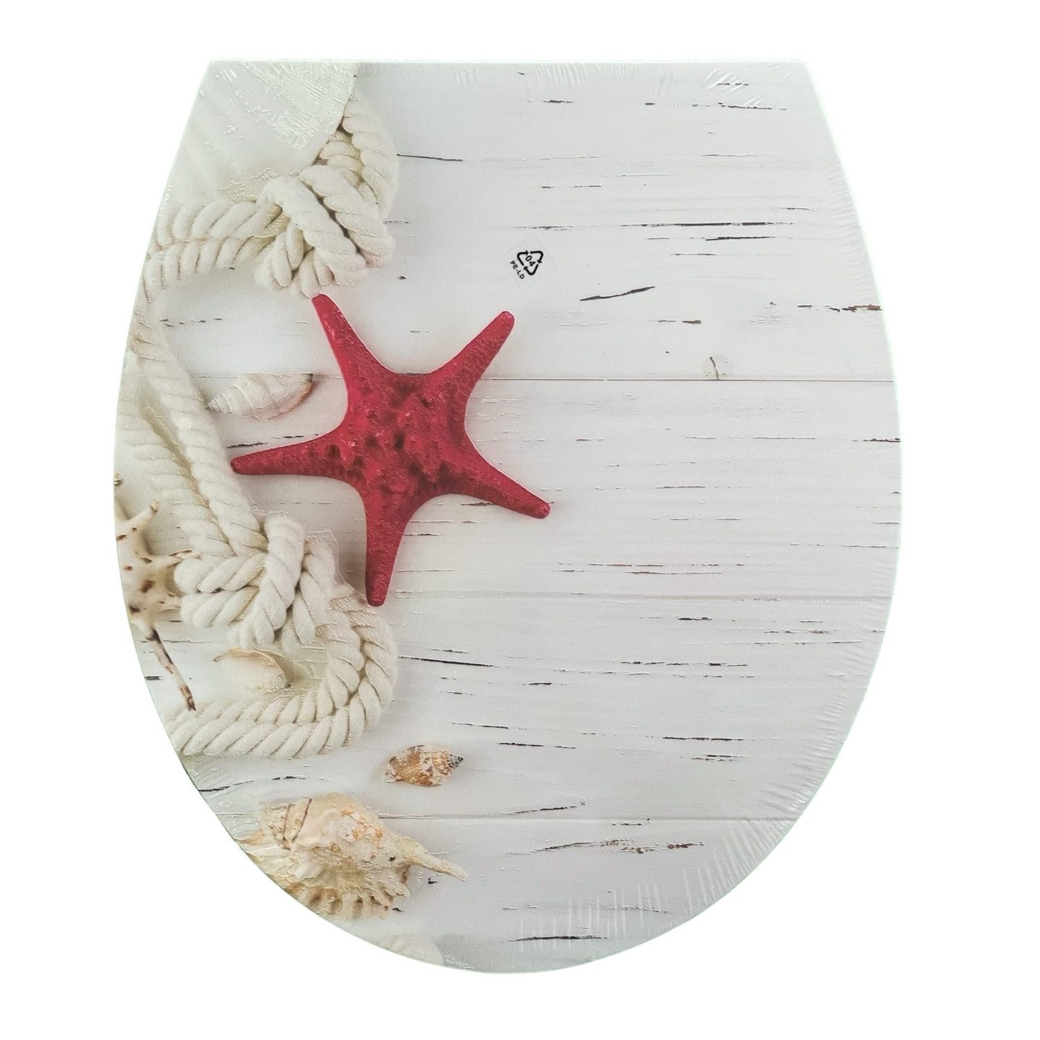 Der WC-Sitz aus Duroplast mit Motiv des roten Meersterns ist eine ideale Kombination aus Funktionalität und Design. Dank seiner Absenkautomatik schließt er sanft und geräuschlos und sorgt so für eine angenehme Nutzung. Der mitgelieferte Schnellverschluss ermöglicht eine einfache Handhabung und die Montage ist durch das passende Montagematerial und die Anleitung spielend einfach. Zudem passt der WC-Sitz auf alle handelsüblichen WCs und bringt so ein maritimes Flair in Ihr Badezimmer. Gönnen Sie sich mit diesem WC-Sitz Komfort und Stil in einem Produkt.