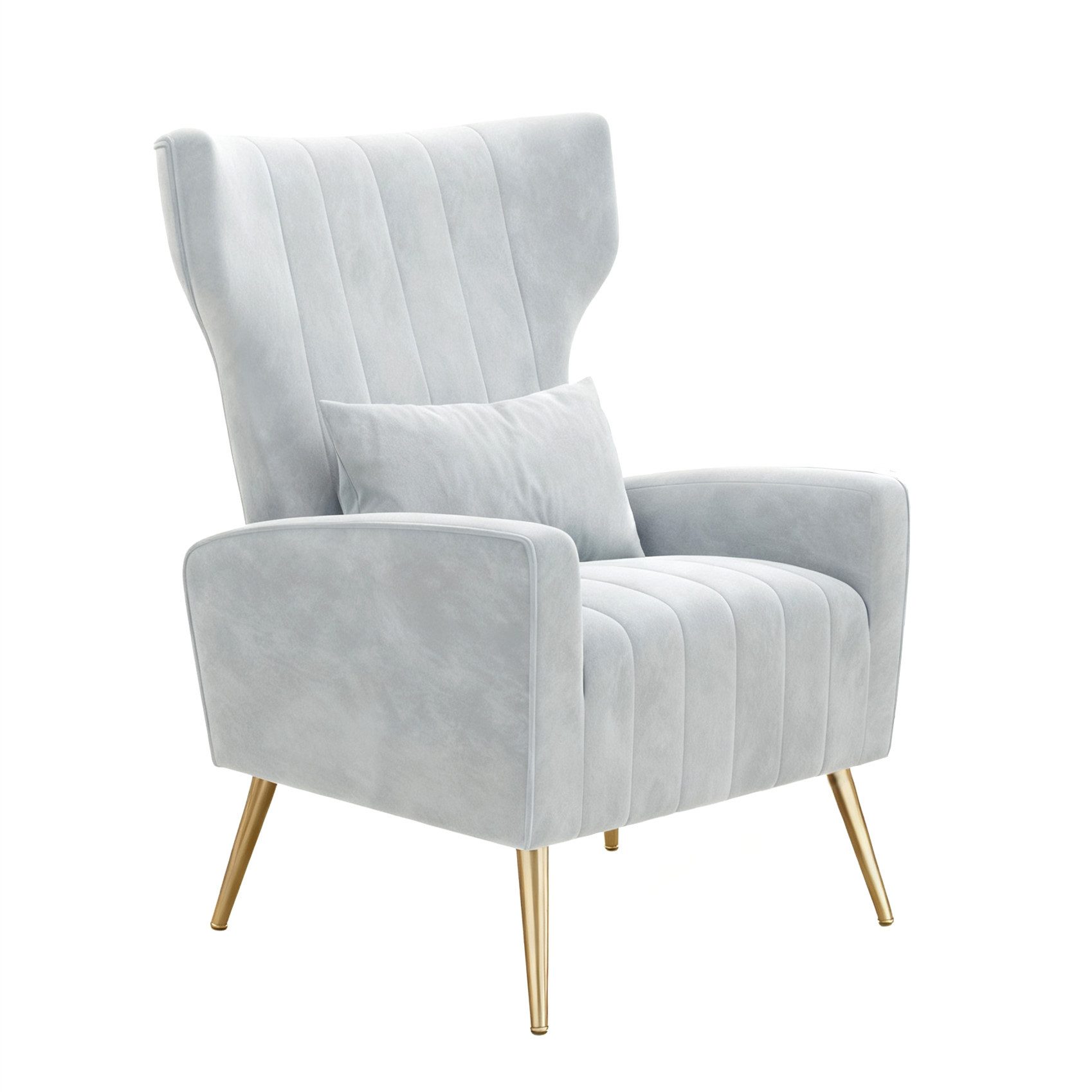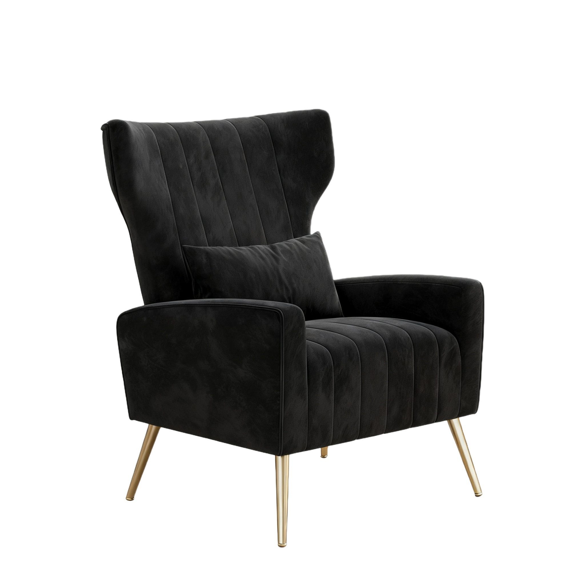 Entdecken Sie diesen eleganten Samt-Wingback-Sessel, der perfekt für Ihre Wohnzimmer-, Schlafzimmer- oder Büroeinrichtung ist. Mit seinem zeitlosen Design im Mid-Century-Stil, hochwertigem Samtbezug und goldenen Beinen bringt er Luxus und Komfort in jeden Raum.