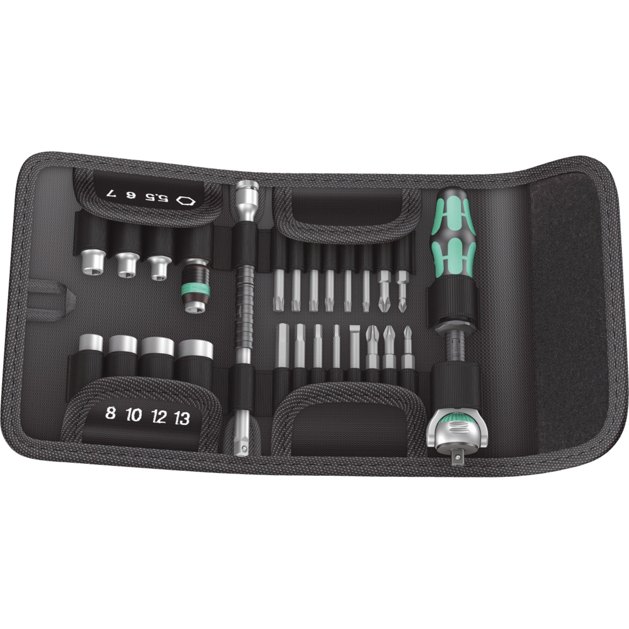 Der 26-teilige Zyklop Speed-Knarrensatz 8100 SC 6 von Wera wird in einer oberflächenschonenden textilen Box geliefert. Die kompakte textile Box führt zu einer ungeahnten Erleichterung in der Mobilität und beim Platzbedarf. Das deutlich reduzierte Gewicht eines Satzes macht das Tragen viel angenehmer. Empfindliche Oberflächen werden bei der Ablage geschont. Sogar das Runterfallen übersteht die textile Box samt Werkzeug unbeschadet. Der Satz beinhaltet eine Zyklop Speed-Knarre mit schwenkbarem Kopf mit 1/2"-Abtrieb, 10 Zyklop-Nüsse, eine Zyklop-Verlängerung (lang) mit Schnelldrehhülse, eine Wobble-Verlängerung, ein Verbindungsteil mit Schnellwechselfutter und 14 Bits. Die Wera Zyklop Speed-Knarre hat einen frei schwenkbaren Knarrenkopf, der durch den beidseitig angebrachten Schiebeschalter in jeder Position verriegelt werden kann. Die definierte Fixierung bei 0°, 15° und 90° nach links und rechts ermöglicht sicheres Arbeiten ohne Verrutschen des Knarrenkopfes. In der 0°-Stellung ist die Zyklop Speed-Knarre wie ein konventioneller Schraubendreher einsetzbar. Problemloses Arbeiten mit großem Handfreiraum ist so selbst in sehr engen oder schwer zu erreichenden Einbausituationen möglich. Die mit 72 Zähnen feinverzahnte Umschaltknarre hat einen niedrigen Rückholwinkel von nur 5°. Der kleine Hub ermöglicht schnelles und präzises Arbeiten in allen Einbaulagen. Der Zyklop Speed ist über das Rändelrad in jeder Position schnell und leicht für den Rechts-/Linksgang umschaltbar. Die Kugelarretierung sorgt für sicheren Sitz der Nüsse und des Zubehörs und damit auch für verlässliche Sicherheit während des Verschraubens. Die Wobble-Verlängerung mit konischem Vierkant lässt eine Schwenkung bis 15° zu, so werden auch schwer zugängliche Schrauben leichter erreichbar. Die Innen-Sechskant-Bits verfügen über das Wera Hex-Plus Profil. Es bietet größere Anlageflächen im Schraubenkopf, die Kerbwirkung wird dadurch auf ein Minimum reduziert und die Zerstörung des Profils verhindert.