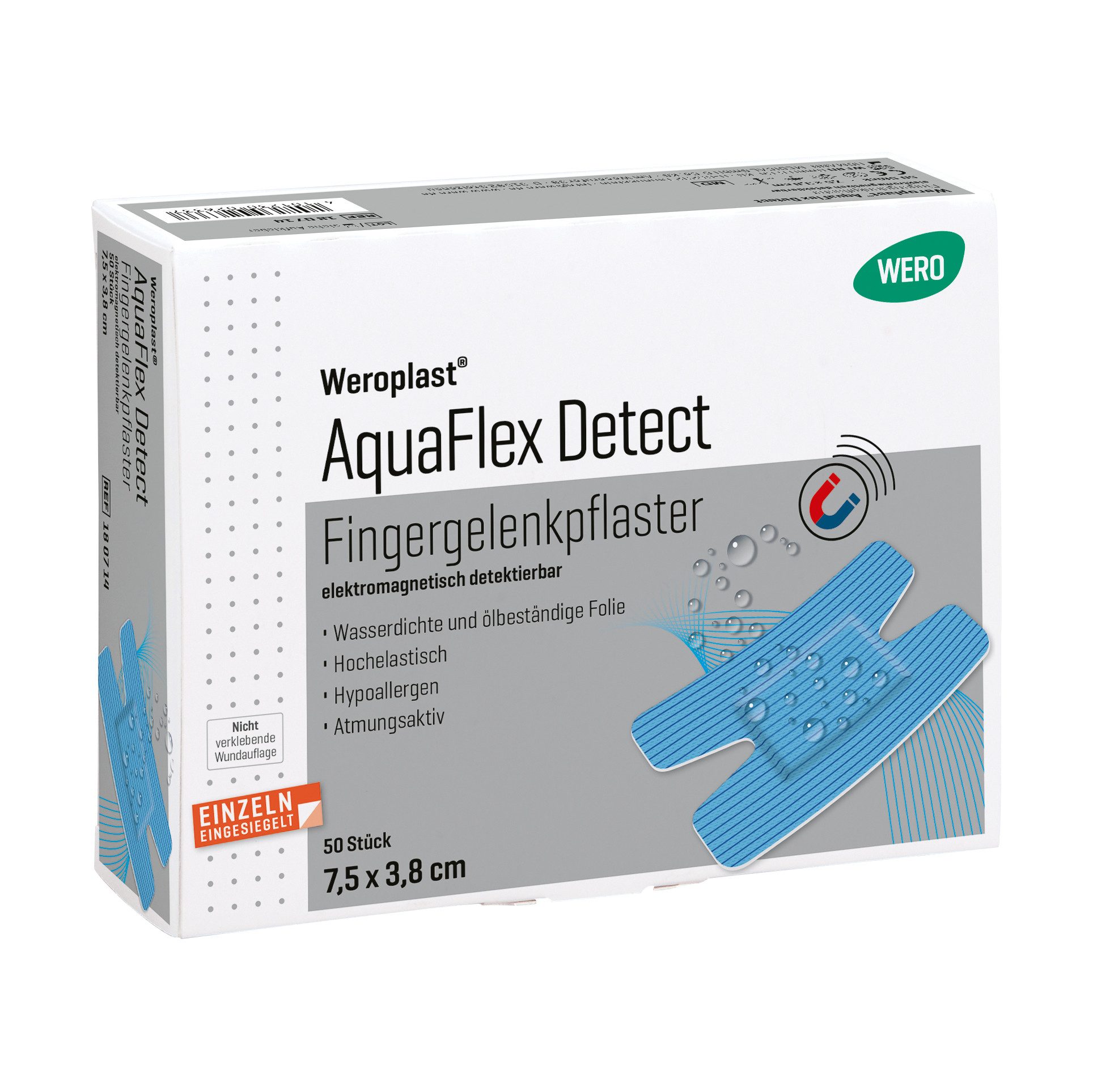 Mit Hilfe der Aluminiumfolie zwischen Wundauflage und Trägermaterial werden die Weroplast® AquaFlex Detect Pflaster durch Metalldetektoren erkannt. Gleichzeitig sind die Pflaster atmungsaktiv, so dass es zu keinerlei Hautaufweichungen (Mazeration) bei längerem Tragen kommt.