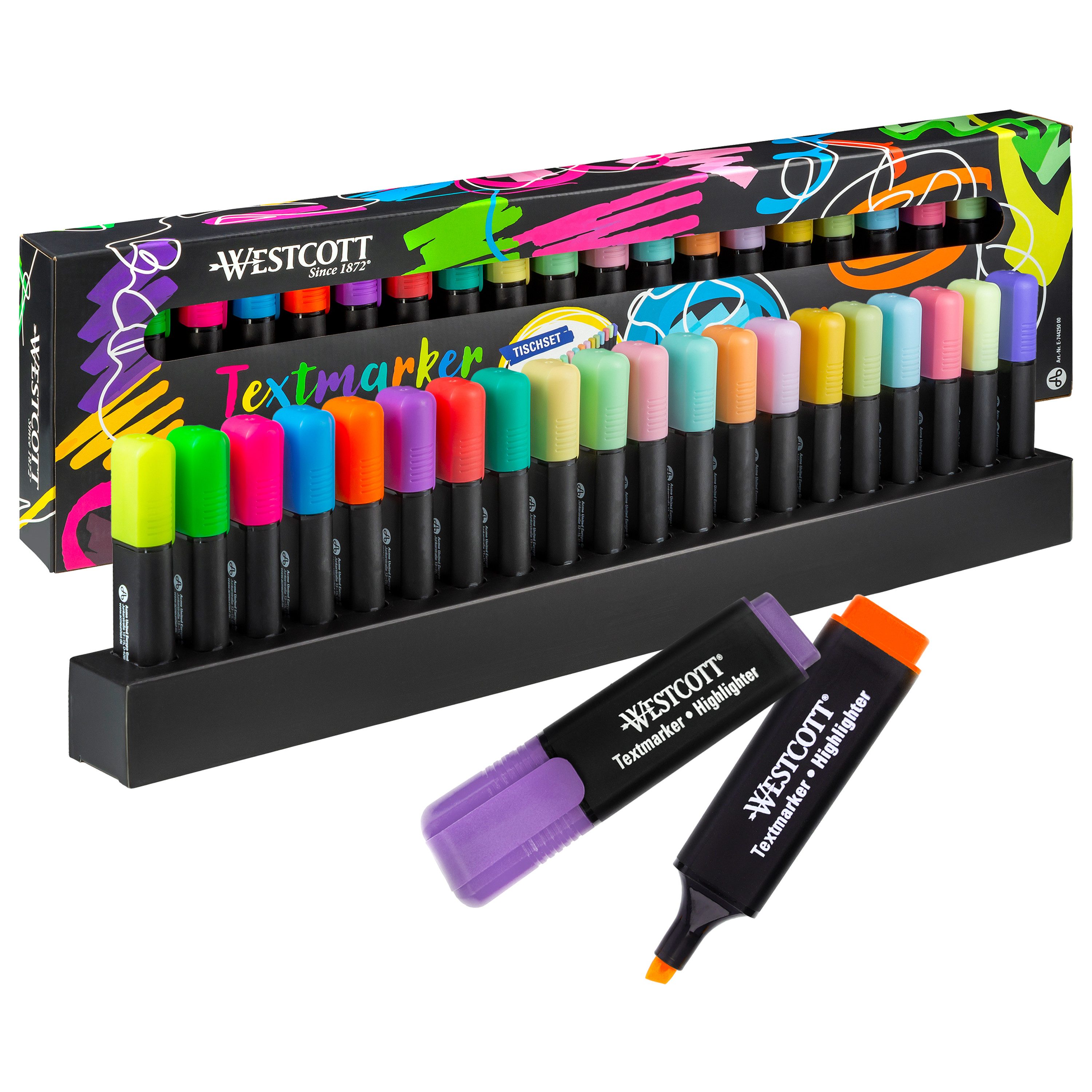Entdecken Sie eine Welt voller kreativer Möglichkeiten für Ihr Büro oder Studio mit dem Westcott Textmarker Tischset mit 20 Stiften.