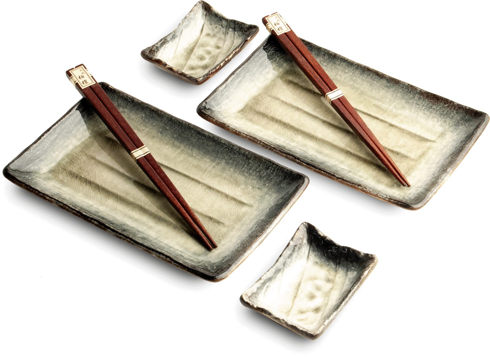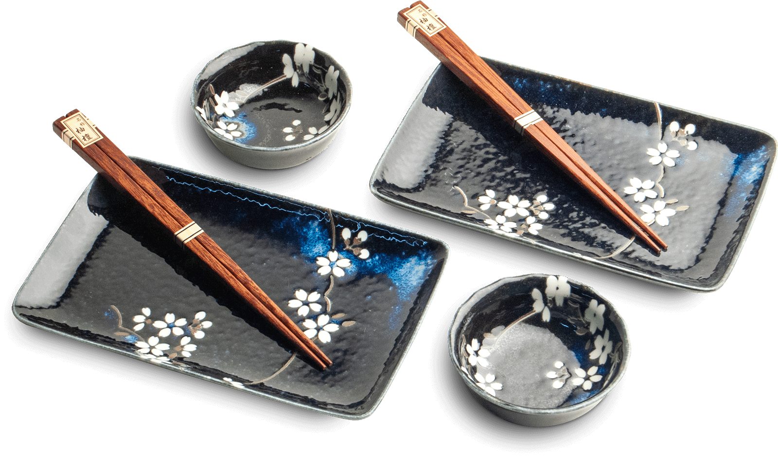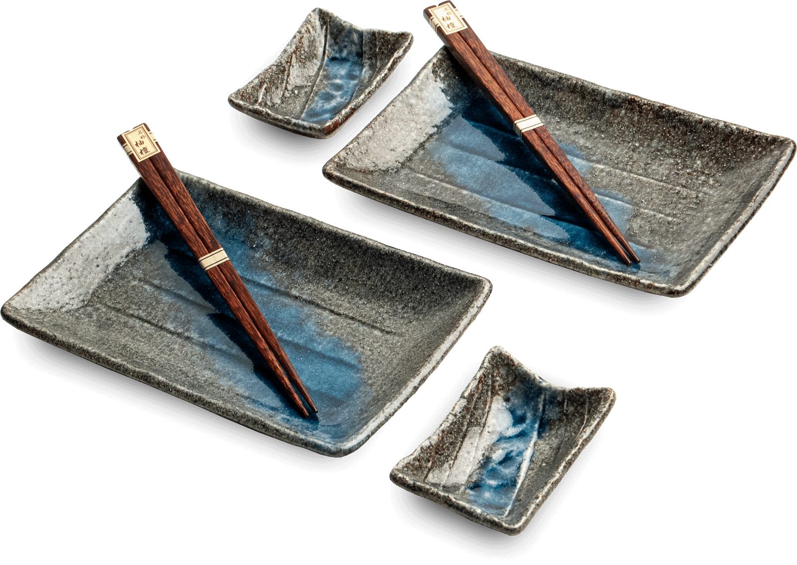 JAPANISCHES SERVIER SET - Всеs was man braucht für einen Sushi Abend. Im Set erhalten Sie jeweils 2 Sushi Teller (rechteckig), 2 Saucenschälchen und 2 Par Essstäbchen aus Holz. Die Sets sind in unterschiedlichen Motiven/Mustern (Farben) verfügbar.