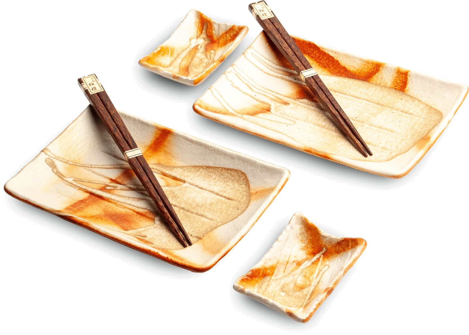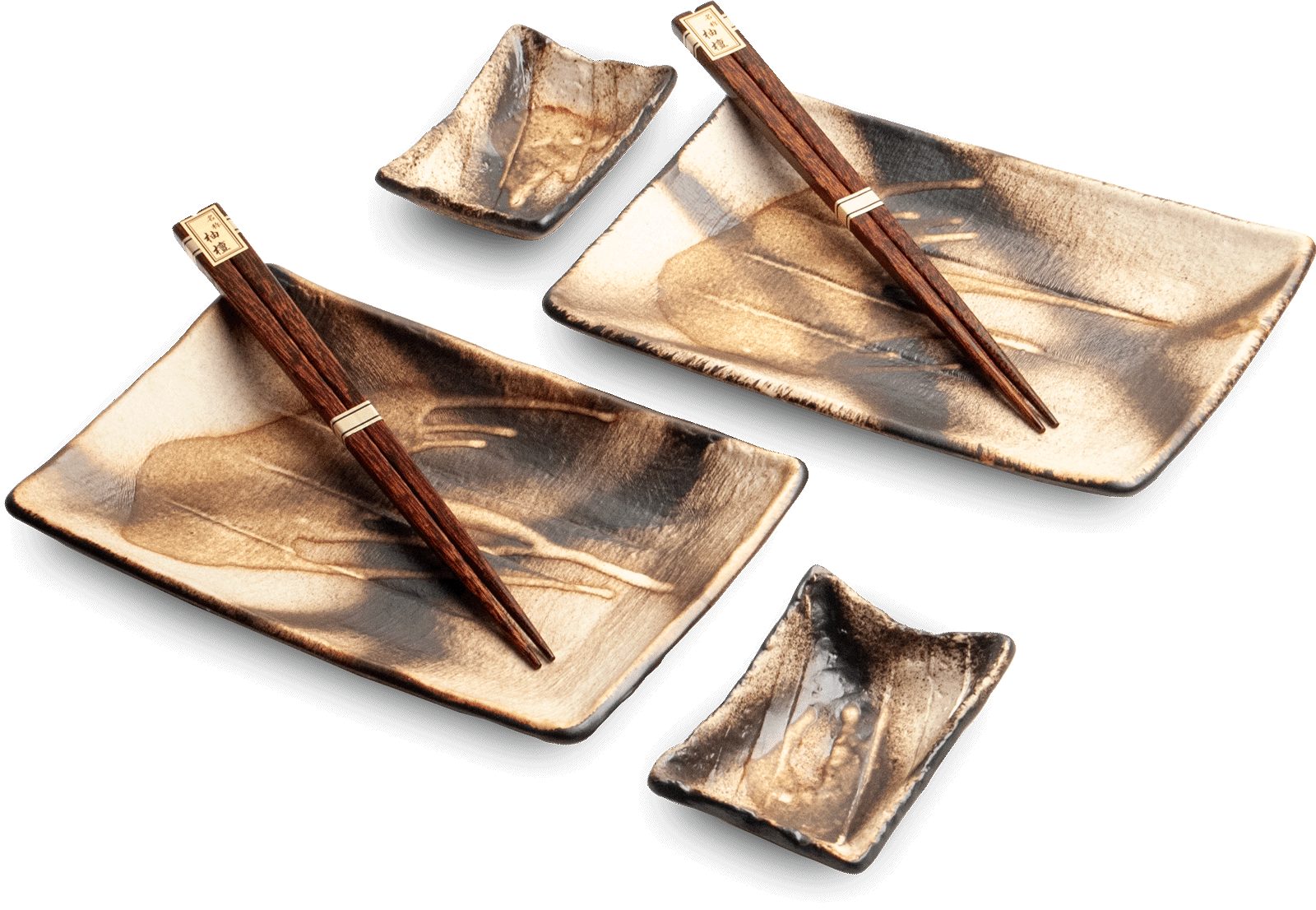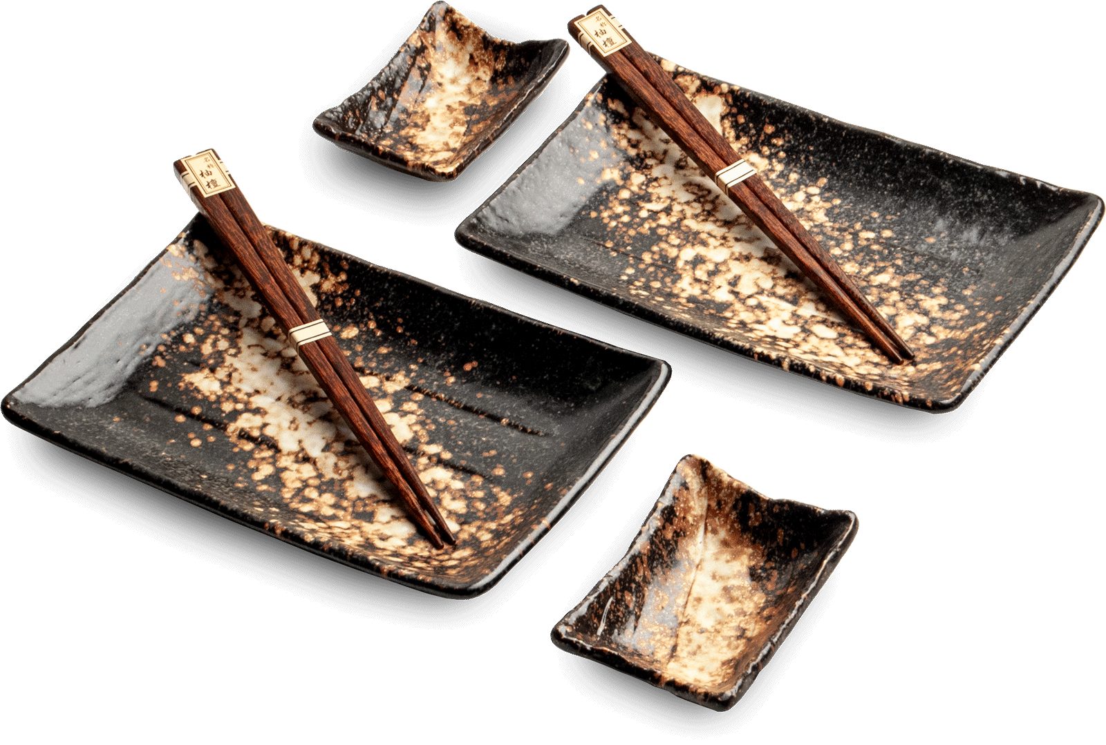 JAPANISCHES SERVIER SET - Всеs was man braucht für einen Sushi Abend. Im Set erhalten Sie jeweils 2 Sushi Teller (rechteckig), 2 Saucenschälchen und 2 Par Essstäbchen aus Holz. Die Sets sind in unterschiedlichen Motiven/Mustern (Farben) verfügbar.