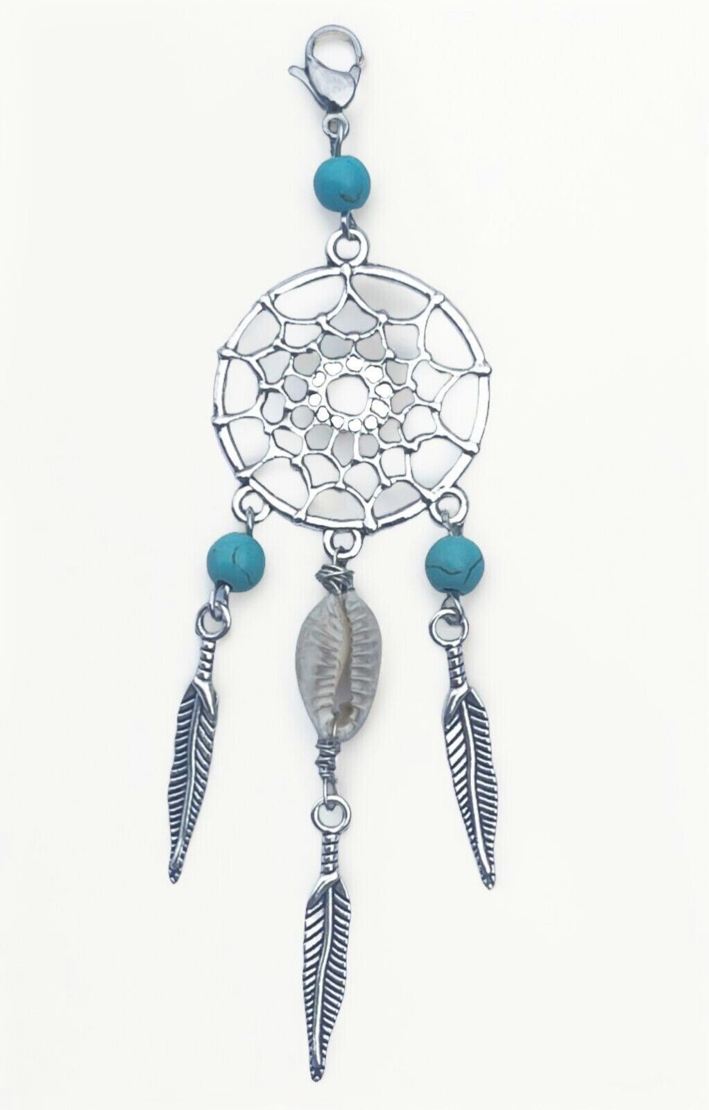 Dieser einzigartige Charm-Anhänger im Stil eines Traumfängers bringt einen Hauch von Boho-Spirit in jedes Schmuckstück oder Accessoire. Mit zarten Muschelelementen, türkisfarbenen Perlen und filigranen Federn verziert, strahlt der Anhänger eine natürliche und entspannte Eleganz aus.