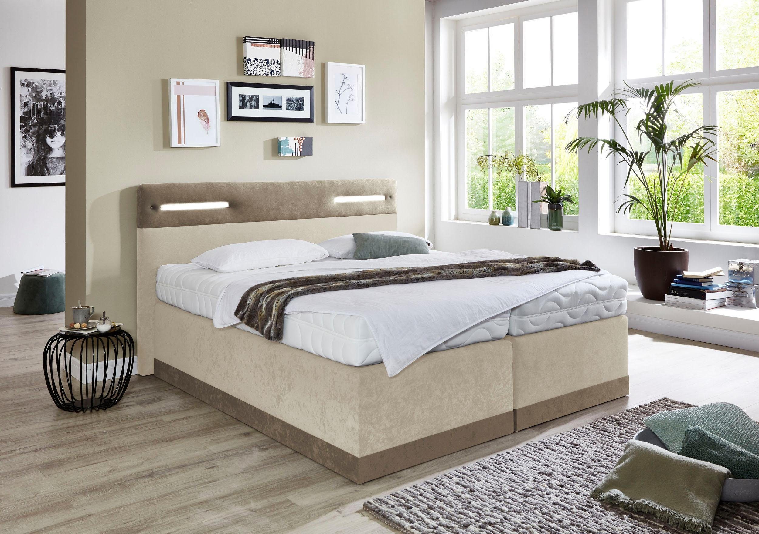 Wissenswertes | Elegantes Boxspringbett mit lichtstarker, dimmbarer LED-Beleuchtung im Kopfteil. Polsterbezüge in ansprechender zwei-Farben-Ausführung. Details: