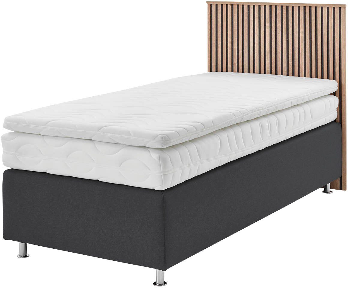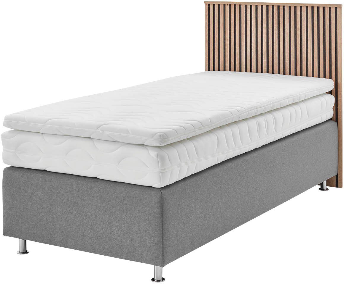 Information Materialzusammensetzung | Kopfteil MDF/Dekor Eiche hell, Boxenbezug: Feinstruktur 100% Polyester, Box: Holzwerkstoff mit Bonnellfederung, Füße: verchromtes Metall, Topper: Kaltschaum |