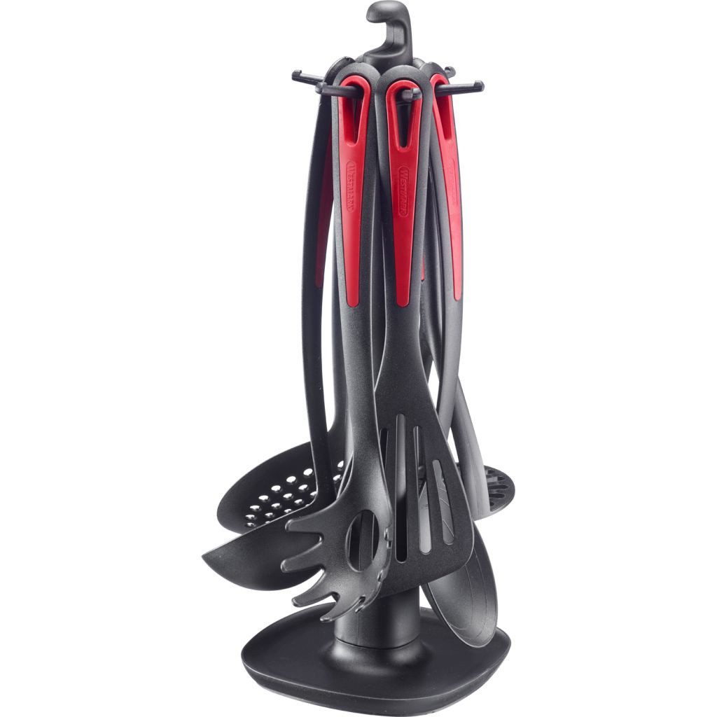 Der 6-armige Ständer zum Aufhängen vieler Küchenutensilien ist mit einem Tragegriff ausgestattet und kann so leicht transportiert werden. Er ist zudem ist drehbar, um den gewünschten Küchenhelfer ganz einfach zu erreichen. Mit diesem Kochbesteck haben Sie für jede Situation den passenden Küchenhelfer zur Hand – ob zum Stampfen, Servieren oder Wenden. Ideal für Antihaftbeschichtungen geeignet. Das Set enthält je Kartoffelstampfer, Brat- und Gemüselöffel, Spaghetti-Löffel, Suppenkelle, Schaumlöffel und Pfannenwender – alles, was man zum Kochen und Zubereiten braucht.