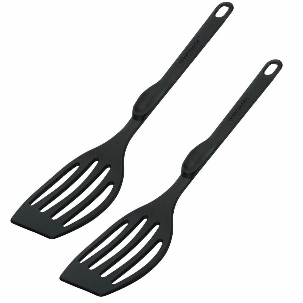 • 2 leichte und schmale Schlitz-Pfannenwender zum Wenden Ihrer Speisen in der Pfanne und zum Servieren am Tisch, Daumenmulde im Griff für sicheren Halt • Kein Zerkratzen von antihaftbeschichtetem Kochgeschirr durch Kunststoffmaterial, einseitig stärker abgerundete Laffe für einfaches Zerteilen von Bratgut in der Pfanne • Angenehmer Halt und ergonomisches Arbeiten durch langen Griff, platzsparend verstaubar dank Aufhänge-Öse, Hochhitzebeständig bis 270°C • Made in Germany; Langlebig, Sorgfältig solide Verarbeitung, Einfache Reinigung, Spülmaschinengeeignet • Pflegehinweis: spülmaschinengeeignet
