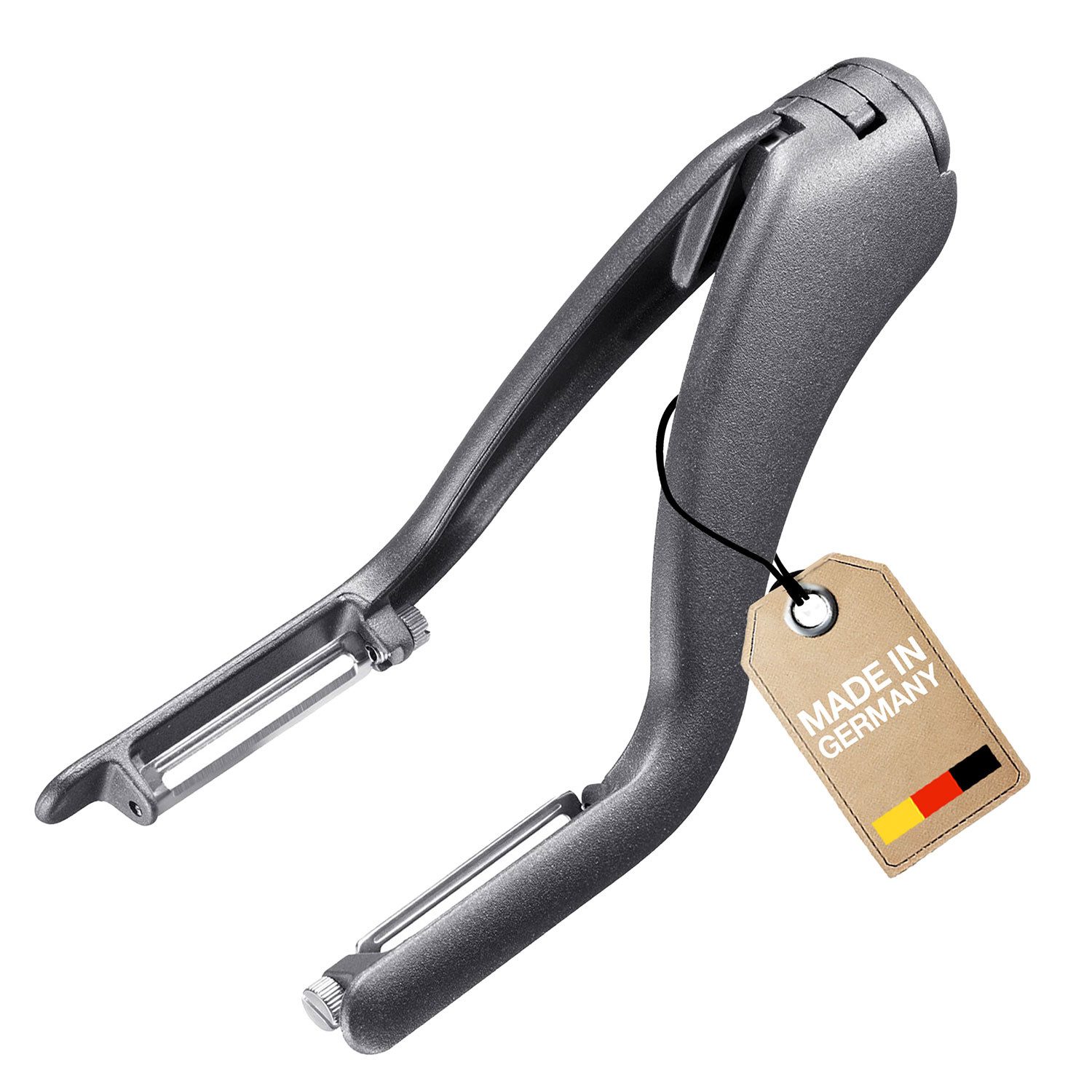 Der Gemüse- /Doppelschäler »Peel-Star KS« ist ein Spezialschäler, der mit zwei Klingen auf gegenüberliegenden Seiten Langgemüse wie Spargel, Möhren, Zucchini, Auberginen, Gurken blitzschnell schält. Die beweglichen Klingen passen sich dabei den Kontuuren der Lebensmittel an. Schon nach wenigen Minuten haben Sie den Dreh raus und der Peel-Star wird Sie mit seiner Effizienz begeistern. Der Schäler selbst ist aus hochwertigem Polyamid gefertigt und die scharfen Klingen sind aus rostfreiem Edelstahl.