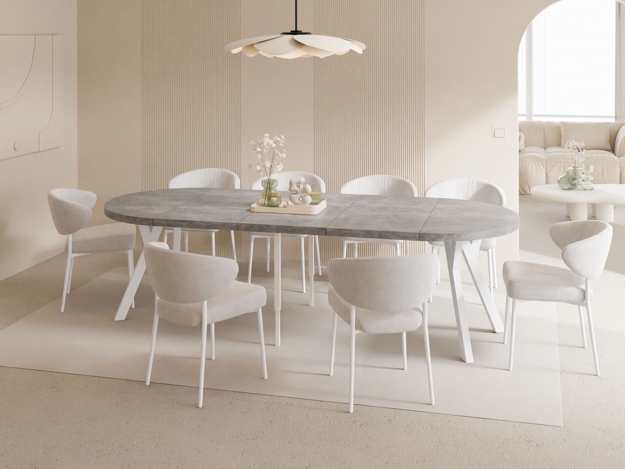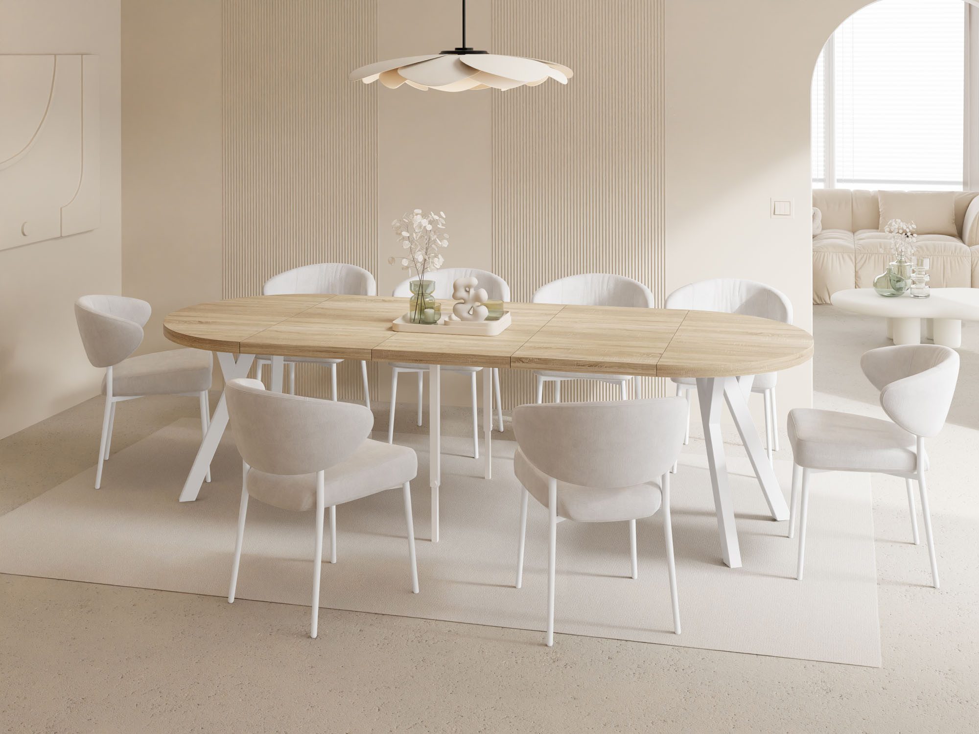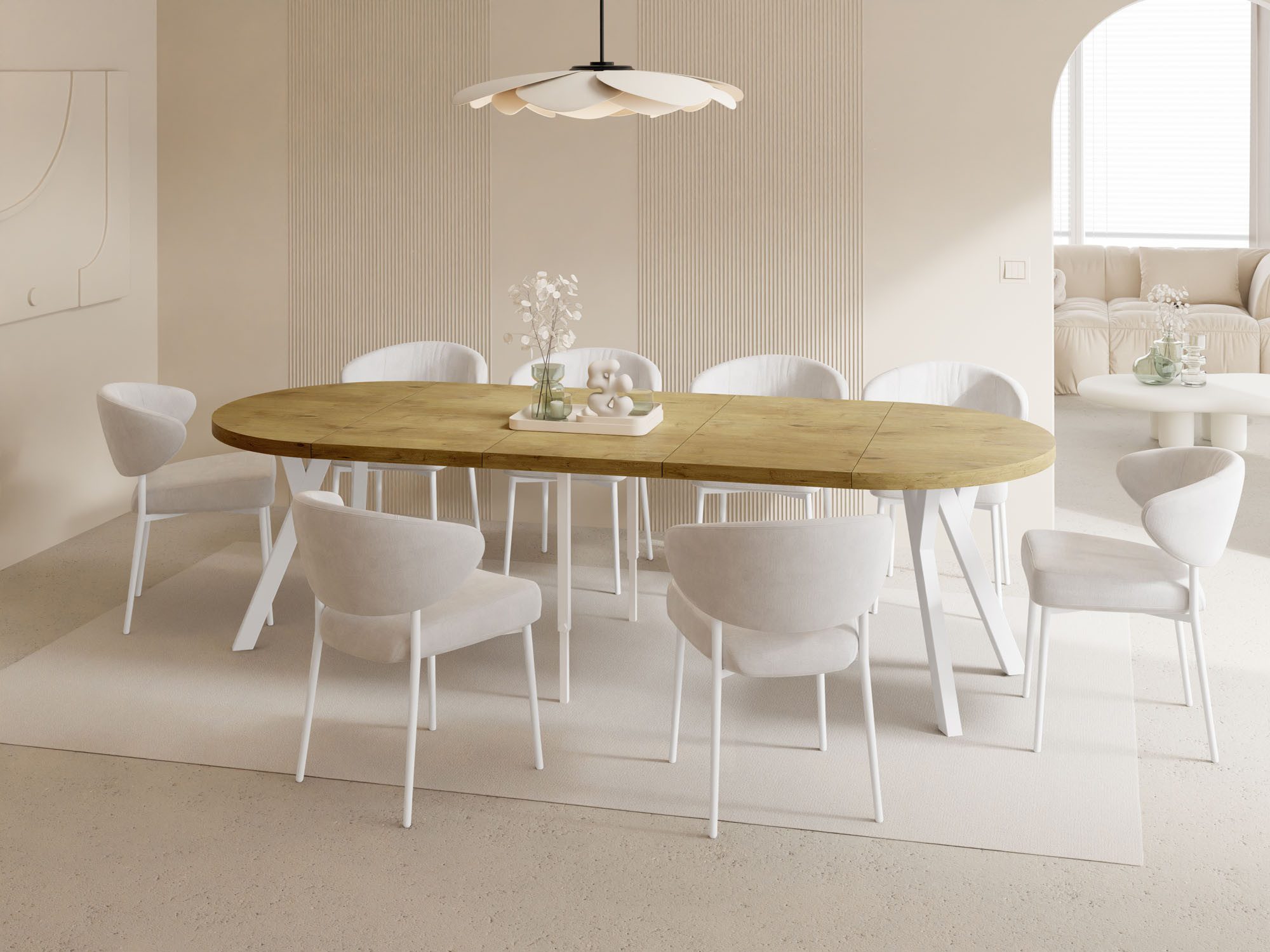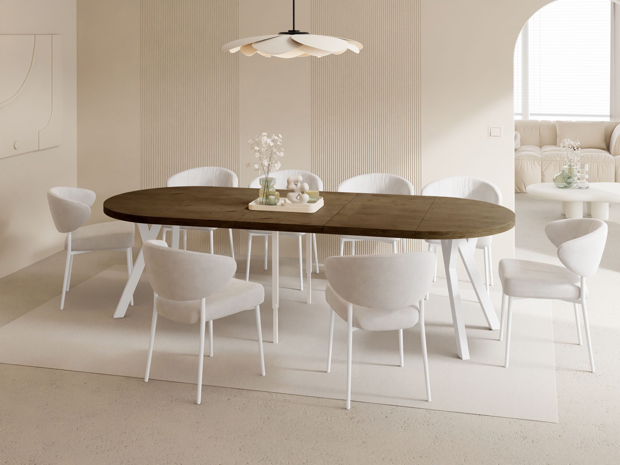 Der Esstisch Twixy bringt moderne Ruhe und klare Formsprache in Ihren Wohn- und Essbereich. Im kompakten Format fügt er sich harmonisch in den Raum ein und spart Platz; bei Bedarf wird er zur großzügigen, sanft ovalen Tafel – ideal für stilvolle Runden mit Familie und Freunden.