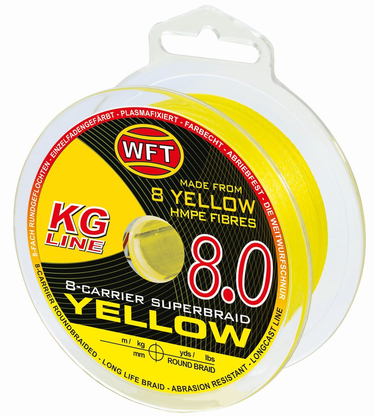 WFT KG 8 gelb - Geflochtene Angelschnur - Die achtfach und eng geflochtene Hauptschnur von WFT ist eine sehr gute Raubfischschnur zum Salzwasserangeln und Süßwasserangeln, die sich sowohl in Kombination mit Stationärrollen als auch mit Baitcaster Angelrollen einsetzen lässt. Die Angelschnur lässt sich beispielsweise sehr gut zum Spinnangeln auf Zander, Barsch und Hecht sowie zum Pilkangeln auf Dorsch und zum Meerforellenangeln einsetzen. Die Geflechtschnur gleitet beim Spinnfischen nahezu geräuschlos durch die Rutenringe und sie ermöglicht sehr weite und platzierte Würfe. Des Впередen besitzt die Hauptschnur sehr hohe Tragkraftwerte gepaart mit einer sehr guten Knoten- und Abriebsfestigkeit, wodurch sie sich unter anderem sehr gut zum Kunstköderangeln an Flüssen mit starker Strömung, Hindernissen und Steinschüttungen sowie beim Meeresangeln an felsigen Untergründen eignet.