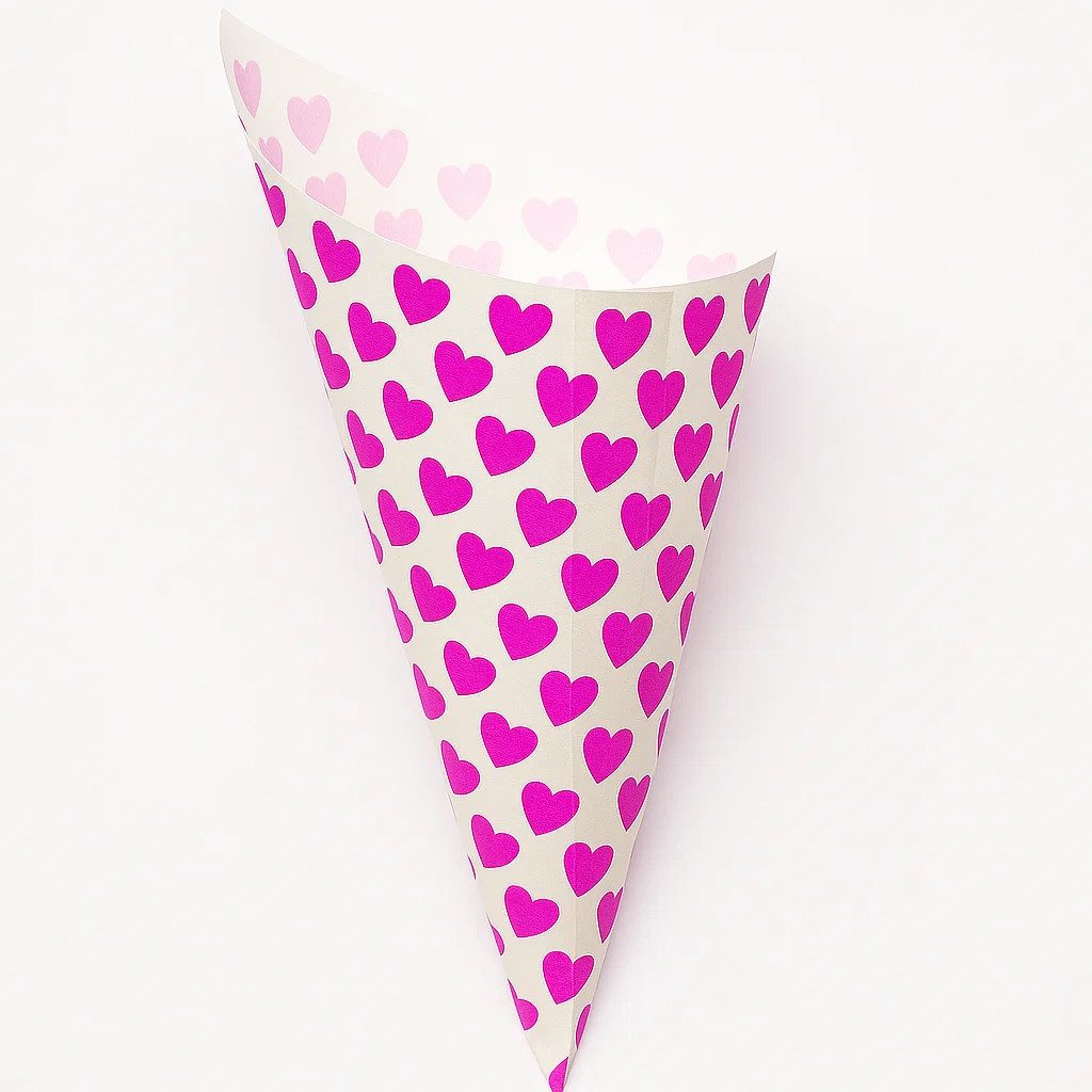 100 Spitztüten an Abreißkette – Pinkes Herzmotiv für Candy Bar, Hochzeit & Kindergeburtstag Diese dekorativen Spitztüten aus Papier bringen Ordnung und Charme an jede Candy Bar. 100 Stück sind an einer langen Schnur vormontiert – einfach aufhängen, einzeln sauber abreißen und sofort befüllen. So entsteht im Handumdrehen eine hygienische, praktische und zugleich liebevolle Deko für Hochzeit, Kindergeburtstag, Babyparty, Einschulung, Kommunion/Taufe, Gartenfest, Firmenevent oder jede Mottoparty. Das rosa/pinke Herzmotiv passt perfekt zu romantischen Themen und moderner Tischdeko. Die Tüten bestehen aus lebensmittelechtem, stabilen Papier und eignen sich ideal als Süßigkeitentüten, Popcorntüten, Keks- oder Nusstüten sowie für kleine Geschenke. Als Mitgebsel oder Gastgeschenk verpacken sie Portionen schnell, ordentlich und griffbereit – direkt am Buffet, an der Wand, am Kinderzelt oder an der Theke. Die Abreißkette (auch Tütenkette/Tütenspender) sorgt dafür, dass immer eine Tüte zur Hand ist und der Bereich rund um die Candy Bar aufgeräumt bleibt. Zwei Вариантыn für jede Portionsgröße: Wählen Sie je nach Einsatz zwischen der Ausführung mit ca. 125 g Füllvolumen (z. B. für Bonbons, Gummibärchen, Mandeln) oder mit ca. 250 g Füllvolumen (z. B. für Popcorn, Gebäck, salzige Snacks). So lassen sich Portionen optimal planen und Lebensmittel sparsam und sauber ausgeben.