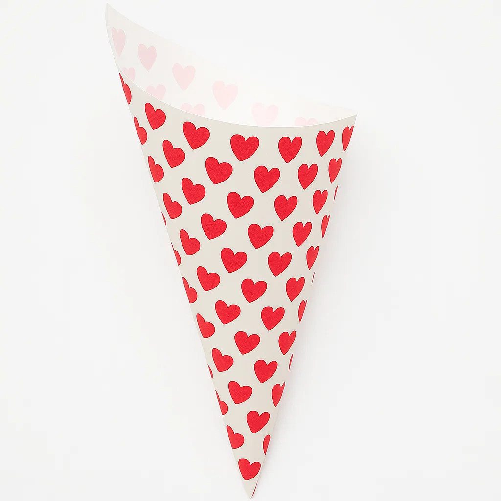 Motiv rot/weiß: weißes Papier mit roten Herzen - Partytüten, Geschenktüten, Süßigkeitentüten für Mitgebsel und Gastgeschenke; passend zu romantischer Tisch- und Buffetdeko.