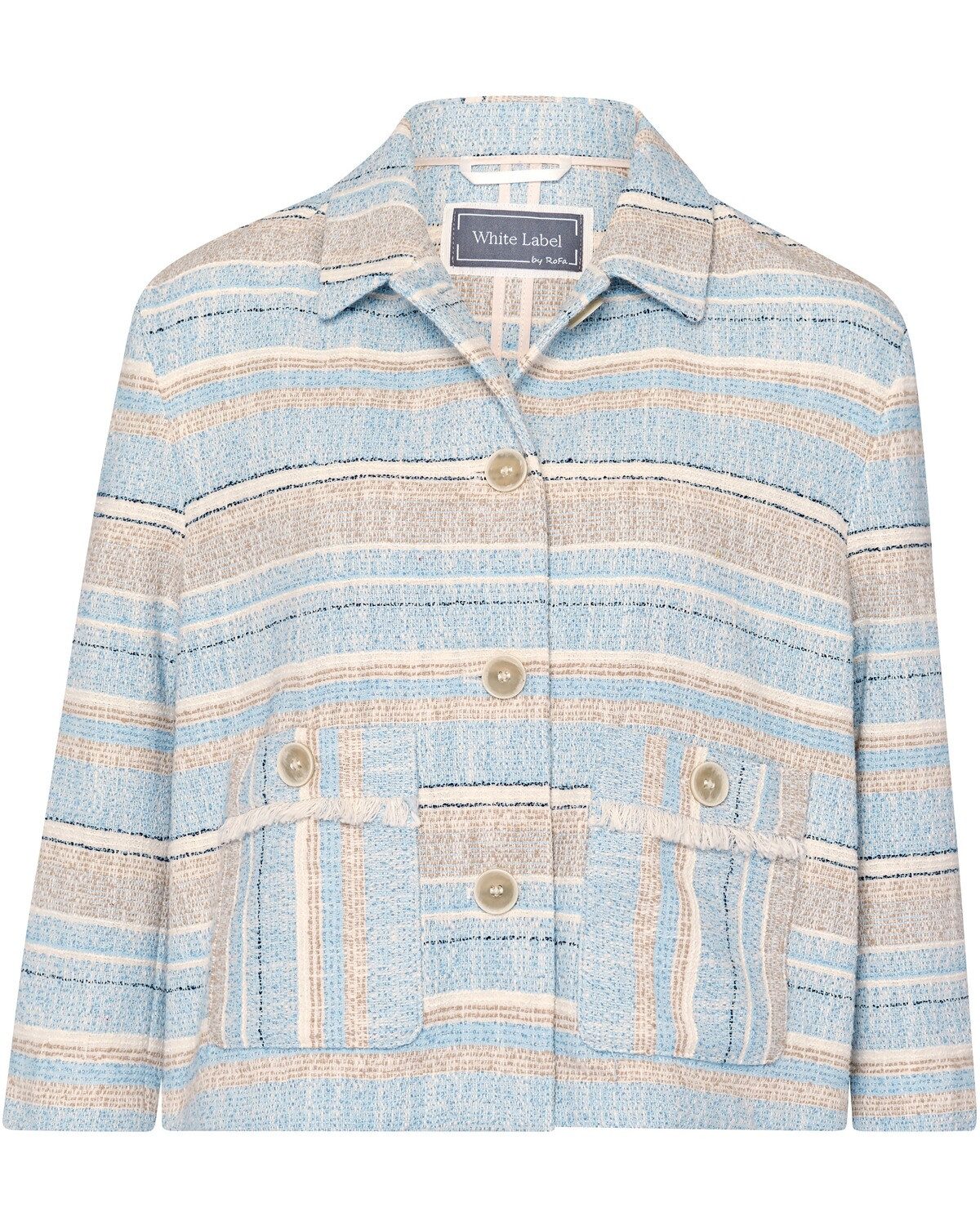 Die Damen Boxy-Jacke von White Label zeichnet sich durch ihren kurzen, kastenförmigen Schnitt aus und verleiht jedem Outfit eine moderne Note. Hergestellt aus einem sommerlichen Streifen-Jacquard, strahlt die Jacke Leichtigkeit und Eleganz aus. Der Umlegekragen und die Knopfleiste verleihen der Jacke einen klassischen Touch, der durch die modernen Details perfekt ergänzt wird. Aufgesetzte Taschen mit Fransenakzenten setzen interessante Highlights und unterstreichen das trendige Design. Besondere Aufmerksamkeit verdienen die Ärmel, die mit kurzen Schlitzen versehen sind und für einen zeitgemäßen Look sorgen. Während der Body der Jacke ungefüttert ist und durch Einfassnähte einen leichten und flexiblen Tragekomfort bietet, sind die Ärmel gefüttert, um zusätzliche Struktur und Komfort zu gewährleisten. Diese Boxy-Jacke ist ideal für warme Sommertage und lässt sich mühelos mit verschiedenen Outfits kombinieren, um sowohl lässige als auch schicke Looks zu kreieren. Oberstoff: 76% Baumwolle, 15% Polyester, 5% Polyacryl, 4% Polyamid