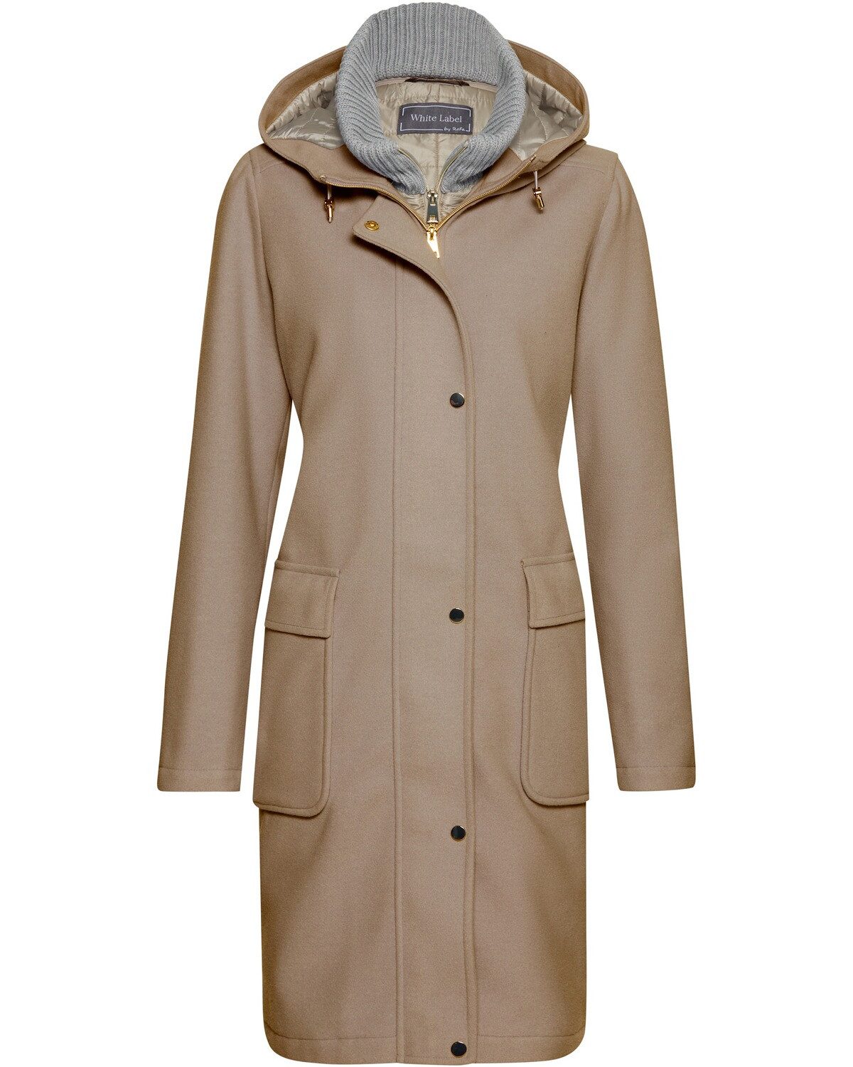 Der Damenmantel von White Label ist die ideale Wahl für die Übergangszeit und verbindet Funktionalität mit modischem Design. Ausgestattet mit einem hochwertigen Steppfutter bietet er nicht nur Wärme, sondern auch eine angenehme Leichtigkeit, die sich perfekt für wechselhaftes Wetter eignet. Der Strickkragen verleiht dem Mantel eine gemütliche Note und sorgt für zusätzlichen Komfort. Praktische Details wie der Reißverschluss, der unter einer Druckknopfleiste verborgen ist, garantieren einen sicheren Verschluss und schützen vor Wind und Wetter. Die fest angebrachte Kapuze mit Kordelzug ermöglicht eine individuelle Anpassung und sorgt dafür, dass der Kopf bei Bedarf gut geschützt ist. Große aufgesetzte Pattentaschen bieten ausreichend Stauraum für persönliche Gegenstände und setzen zugleich einen modischen Akzent. Der leicht taillierte Schnitt des Mantels schmeichelt der Figur und sorgt für eine feminine Silhouette. Ob für einen Spaziergang in der Stadt oder einen Ausflug ins Grüne, dieser Mantel ist vielseitig einsetzbar und lässt sich problemlos mit verschiedenen Outfits kombinieren. Ein Must-have für jede modebewusste Frau, die Wert auf Stil und Funktion legt. Oberstoff: 80% Polyester, 10% Viskose, 10% Polyacryl; Futter: 100% Polyester; Wattierung: 100% Polyester; Sonstige Materialien: Strickkragen, 65% Polyester, 35% Baumwolle