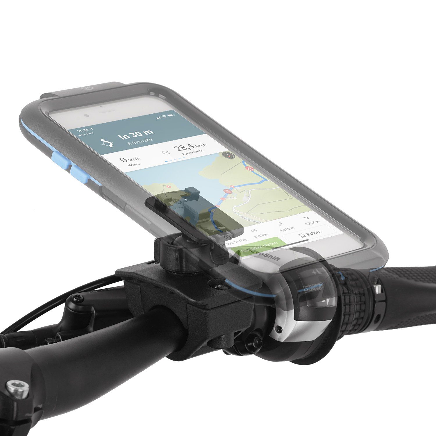 Die praktische Halterung kann an Lenkern mit einem Durchmesser von 16 bis 33 mm befestigt werden. Dank des Kugelgelenks ist der Lenkeradapter neig-, schwenk- und um 360 Grad drehbar. Kompatible Cases können so im Hoch- und Querformat betrieben werden. Die Sicherungslasche verbindet den Adapter und ein passendes Case dauerhaft und verhindert das ungewollte Herausrutschen (z.B. bei Stößen oder Erschütterungen).