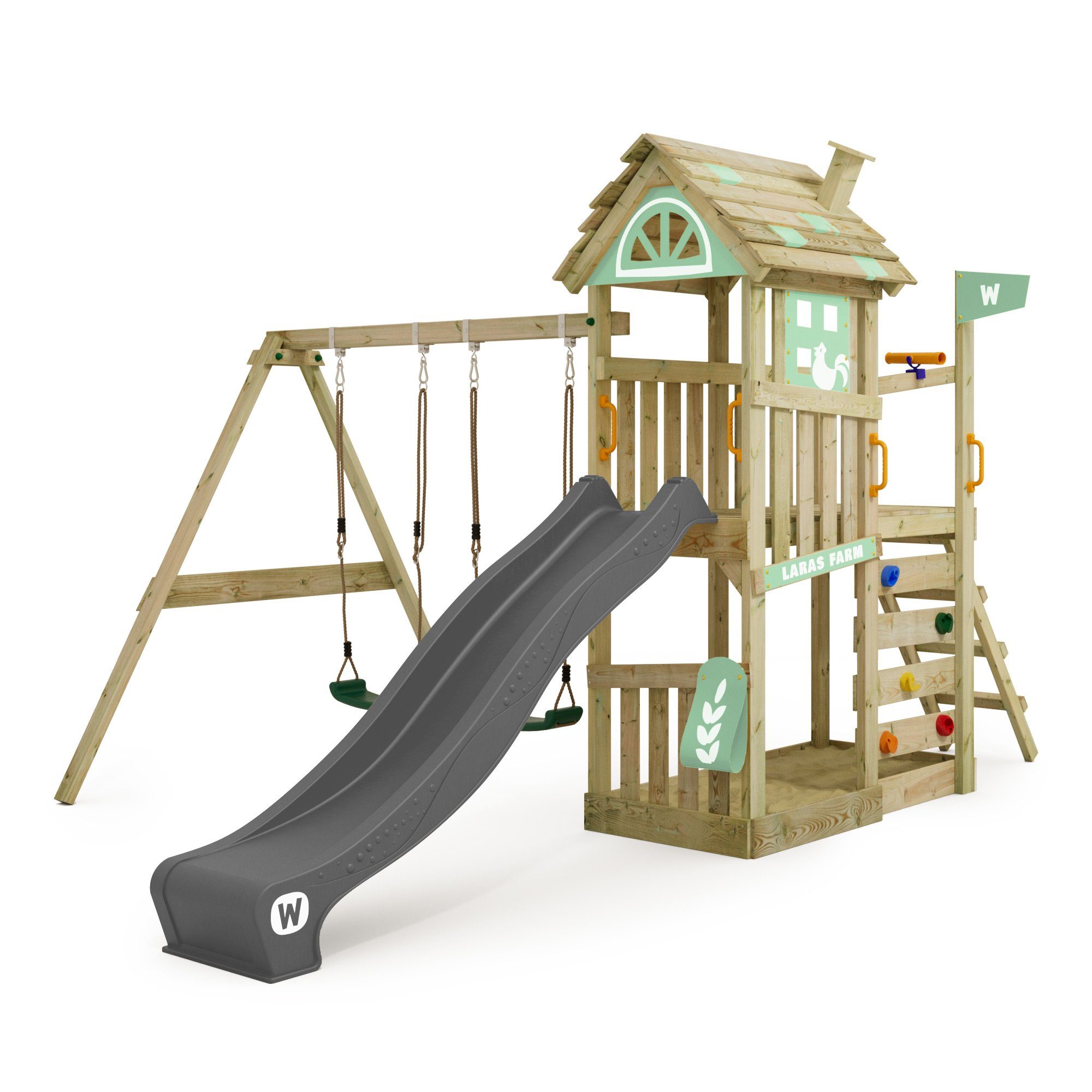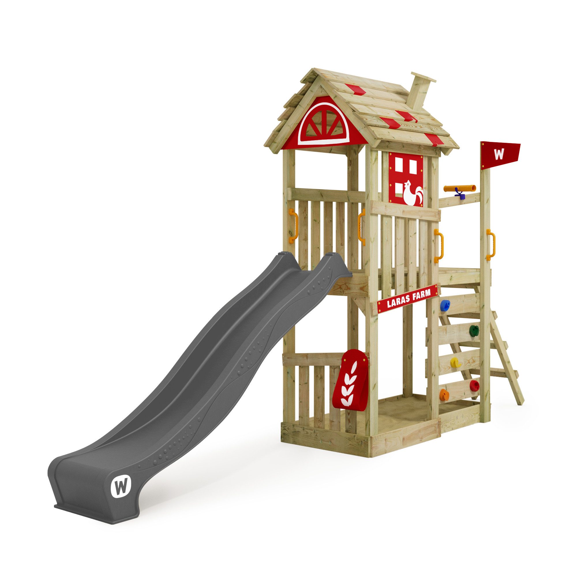 WickeySpielturmFarmFlyer mit verschiedenen Anbaumodulen, Rutsche und Kletterwand