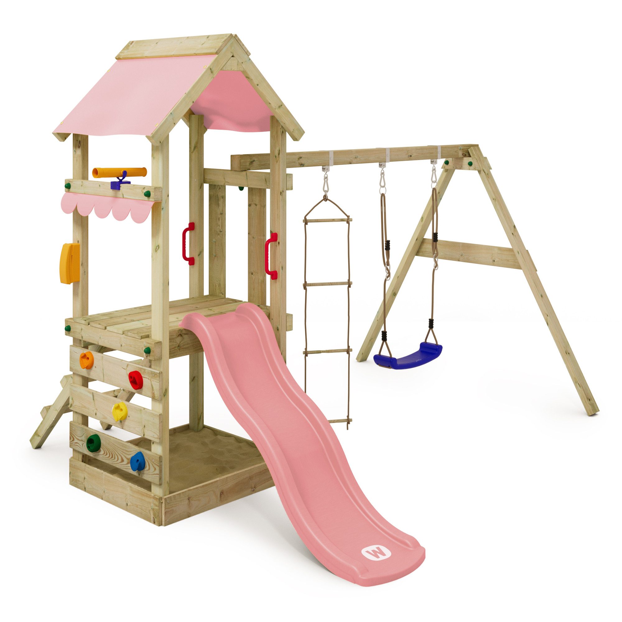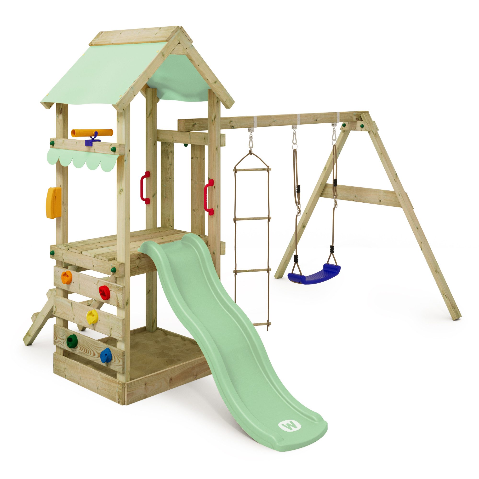 Lieferumfang | Wellenrutsche mit Wasseranschluss 175 cm Schaukelsitz inkl. verstellbarer Seile Strickleiter mit Holzsprossen 3 Rundum-Schaukelschellen mit Kunststofflagern Schaukelverbinder aus Holz 5 Klettersteine 2 Sicherheitshandgriffe Teleskop Telefon Schräge Kletterleiter Gerade Kletterwand Wetterfestes Planendach 650 g/m² Markise Wickey-Aufkleber Integrierter Sandkasten Все benötigten Schrauben Zweiteilige Sicherheitskappen zum Verdecken der Schrauben Ausführliche Montageanleitung für den einfachen Aufbau |