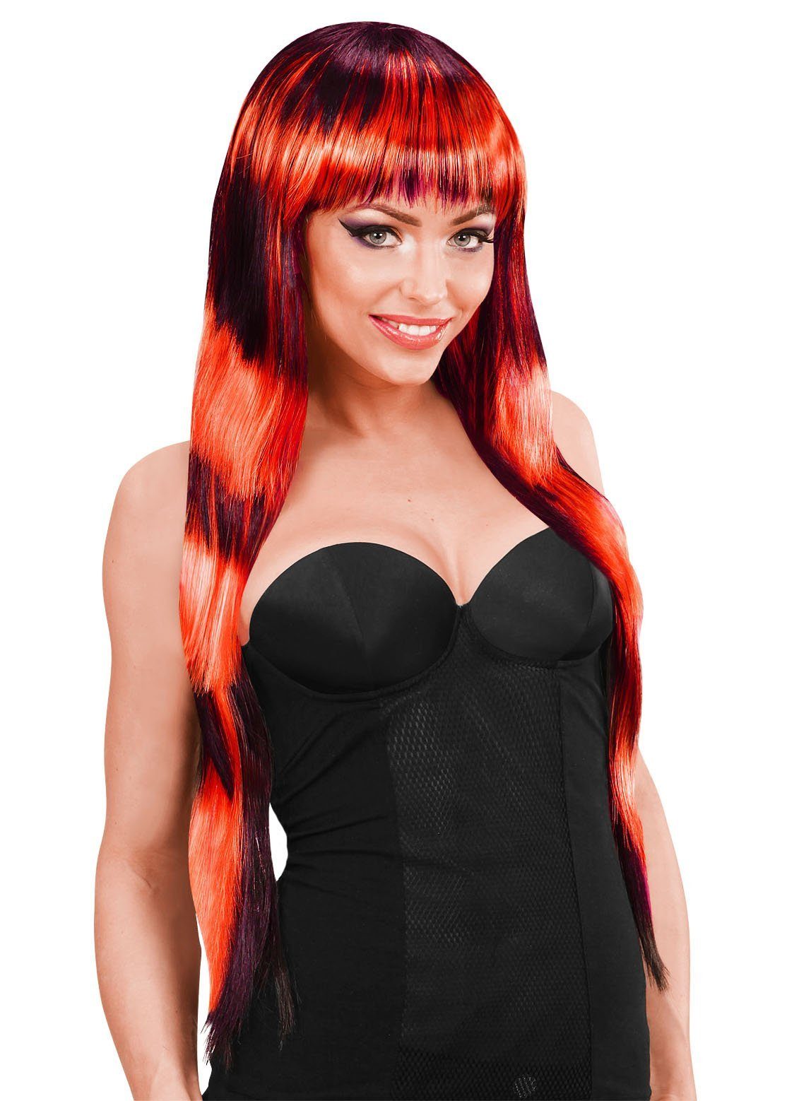 Für Festival Outfits, farbenfrohe Faschingskostüme, Neon Party und die verführerische Teufelin: leuchtend rote Langhaarperücke mit schwarzen Flecken und sehr langen Seitensträhnen.