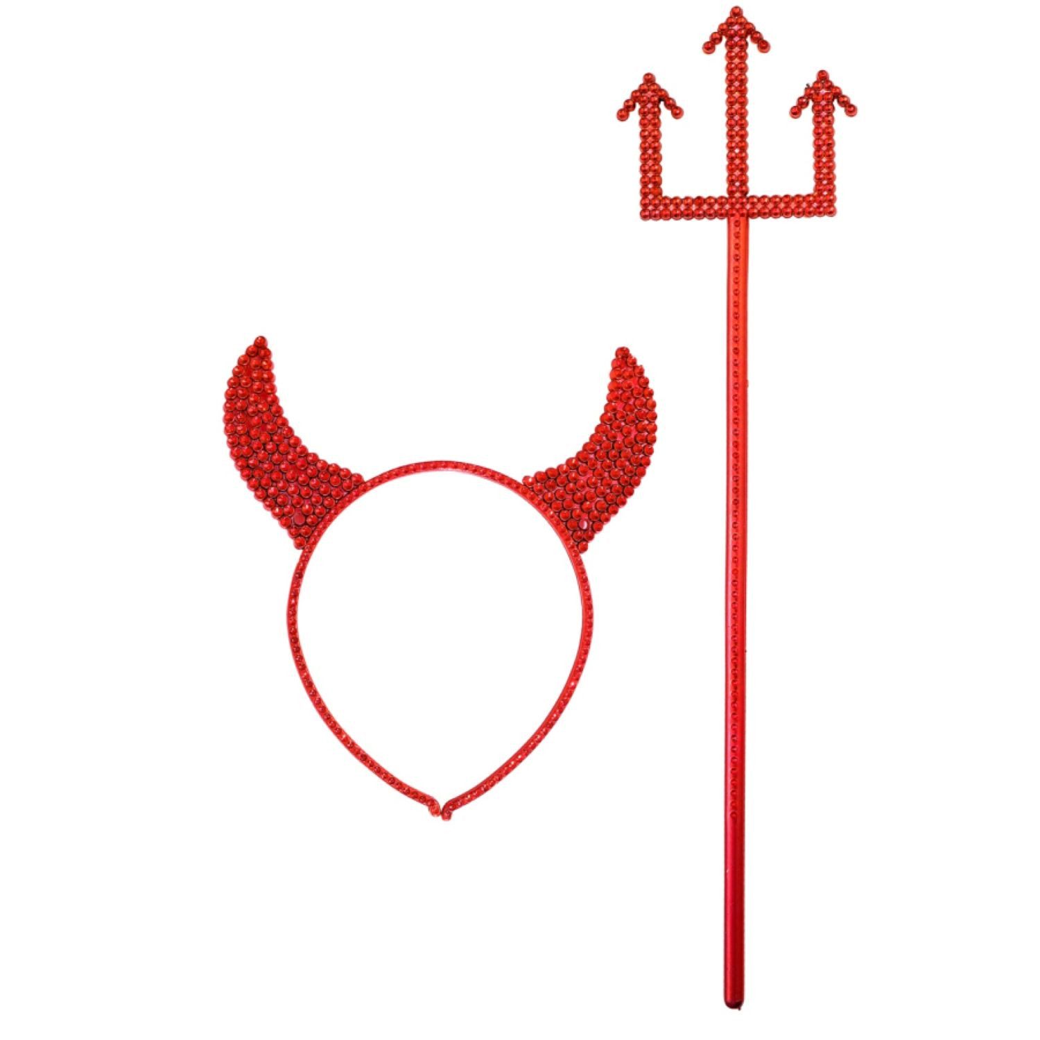 Teuflisches Zubehör: Roter Haarreif mit glänzenden Hörnern und passender Dreizack – ideal für Halloween, Karneval oder dämonische Mottopartys.