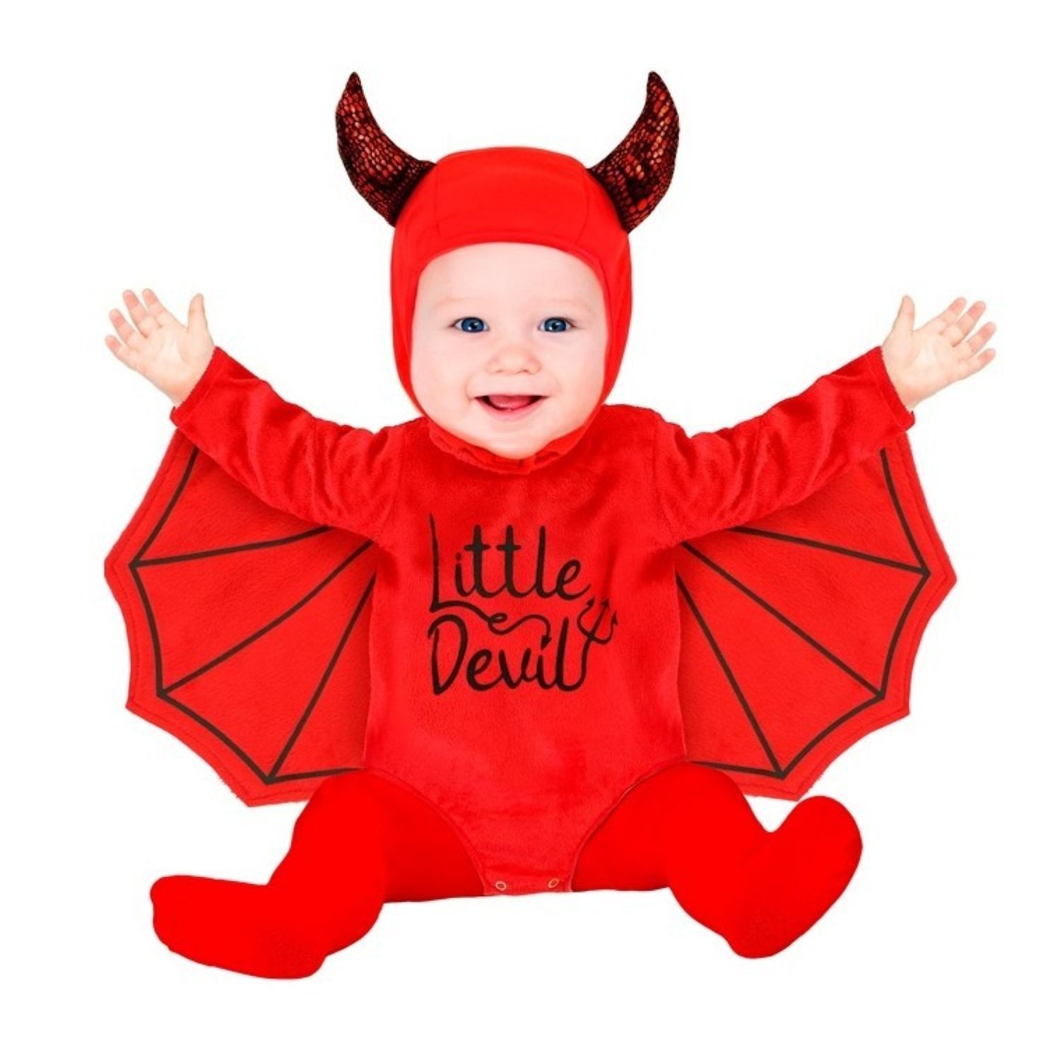 Lieferung inkl. Overall & Kopfbedeckung mit angenähten Hörnern – einfache Verwandlung in ein süßes kleines Teufelchen.