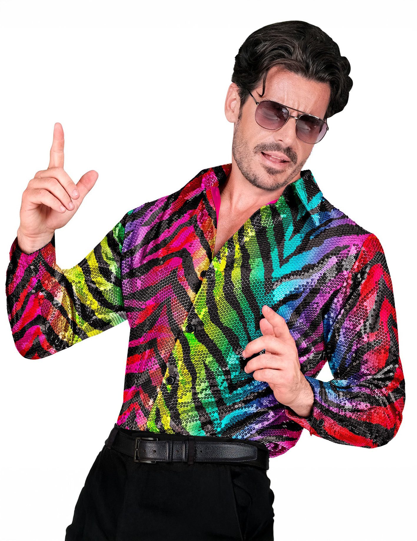 Setzen Sie ein Statement mit diesem auffälligen Herrenhemd aus leichtem Stoff, das mit bunten Pailletten und einem markanten Regenbogen-Tigermuster verziert ist. Die ideale Kombination aus Glanz und Extravaganz – perfekt für einen großen Auftritt. Das farbenfrohe Design mit funkelnden Pailletten fängt das Licht ein und sorgt für einen spektakulären Effekt. Der taillierte Schnitt, der klassische Kragen und die langen Ärmel verleihen dem Hemd eine elegante Silhouette, während die hochwertige Verarbeitung dem auffälligen Stil eine edle Note gibt. Ob Karneval, Disco-Event, Festival oder Motto-Party – dieses Hemd garantiert einen glänzenden Auftritt mit maximaler Wirkung.
